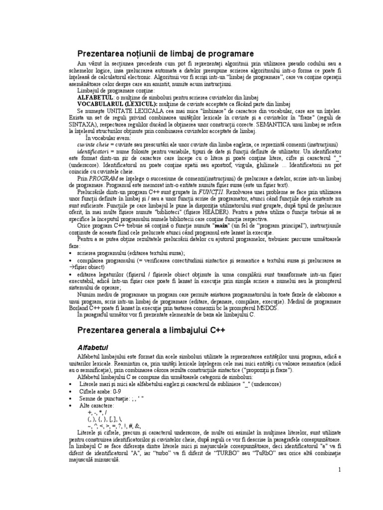Am vzut n seciunea precedenta cum pot fi reprezentai algoritmii prin utilizarea pseudo codului sau a schemelor logice, insa prelucrarea automata a datelor presupune scrierea algoritmului intr-o forma ce poate fi neleas de calculatorul electronic. Algoritmii vor fi scrii intr-un limbaj de programare, care va conine operaii asemntoare celor despre care am amintit, numite acum instruciuni. Limbajul de programare conine: ALFABETUL: o mulime de simboluri pentru scrierea cuvintelor din limbaj VOCABULARUL (LEXICUL): mulime de cuvinte acceptate ca fcnd parte din limbaj Se numete UNITATE LEXICALA cea mai mica "mbinare" de caractere din vocabular, care are un neles. Exista un set de reguli privind combinarea unitilor lexicale n cuvinte i a cuvintelor n "fraze" (reguli de SINTAXA), respectarea regulilor ducnd la obinerea unor construcii corecte. SEMANTICA unui limbaj se refera la nelesul structurilor obinute prin combinarea cuvintelor acceptate de limbaj. n vocabular avem: cuvinte cheie = cuvinte sau prescurtri ale unor cuvinte din limba engleza, ce reprezint comenzi (instruciuni) identificatori = nume folosite pentru variabile, tipuri de date i funcii definite de utilizator. Un identificator este format dintr-un ir de caractere care ncepe cu o litera i poate conine litere, cifre i caracterul "_" (underscore). Identificatorul nu poate conine spatii sau apostrof, virgula, ghilimele ... Identificatorii nu pot coincide cu cuvintele cheie. Prin PROGRAM se nelege o succesiune de comenzi(instruciuni) de prelucrare a datelor, scrise intr-un limbaj de programare. Programul este memorat intr-o entitate numita fiier sursa (este un fiier text). Prelucrrile dintr-un program C++ sunt grupate n FUNCII. Rezolvarea unei probleme se face prin utilizarea unor funcii definite n limbaj i / sau a unor funcii scrise de programator, atunci cnd funciile deja existente nu sunt suficiente. Funciile pe care limbajul le pune la dispoziia utilizatorului sunt grupate, dup tipul de prelucrare oferit, n mai multe fiiere numite "biblioteci" (fiiere HEADER). Pentru a putea utiliza o funcie trebuie s se specifice la nceputul programului numele bibliotecii care conine funcia respectiva. Orice program C++ trebuie s conin o funcie numita "main" (un fel de program principal), instruciunile coninute de aceasta fiind cele prelucrate atunci cnd programul este lansat n execuie. Pentru a se putea obine rezultatele prelucrrii datelor cu ajutorul programelor, trebuiesc parcurse urmtoarele faze: scrierea programului (editarea textului sursa); compilarea programului (= verificarea corectitudinii sintactice i semantice a textului sursa i prelucrarea sa fiier obiect) editarea legaturilor (fiierul / fiierele obiect obinute n urma compilrii sunt transformate intr-un fiier executabil, adic ntr-un fiier care poate fi lansat n execuie prin simpla scriere a numelui sau la prompterul sistemului de operare; Numim mediu de programare un program care permite asistarea programatorului n toate fazele de elaborare a unui program, scris intr-un limbaj de programare (editare, depanare, compilare, execuie). Mediul de programare Borland C++ poate fi lansat n execuie prin tastarea comenzii bc la prompterul MSDOS. n paragraful urmtor vor fi prezentate elementele de baza ale limbajului C.