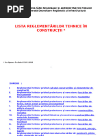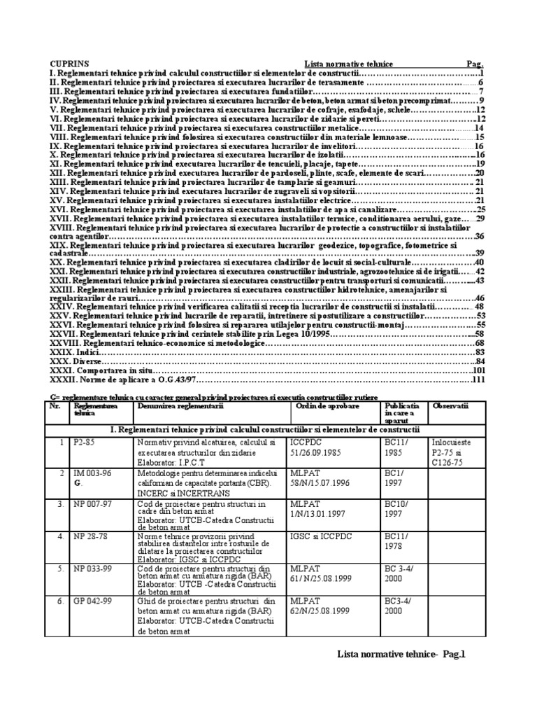 Reglementari tehnice privind proiectarea si executarea lucrarilor de terasamente .6 III. Reglementari tehnice privind proiectarea si executarea fundatiilor. 7 IV. Reglementari tehnice privind proiectarea si executarea lucrarilor de beton, beton armat si beton precomprimat. 9 V. Reglementari tehnice privind proiectarea si executarea lucrarilor de cofraje, esafodaje, schele..12 VI. Reglementari tehnice privind proiectarea si executarea lucrarilor de zidarie si pereti.12 VII. Reglementari tehnice privind proiectarea si executarea constructiilor metalice...14 VIII. Reglementari tehnice privind folosirea si executarea constructiilor din materiale lemnoase.15 IX. Reglementari tehnice privind proiectarea si executarea lucrarilor de invelitori16 X. Reglementari tehnice privind proiectarea si executarea lucrarilor de izolatii..16 XI. Reglementari tehnice privind executarea lucrarilor de tencuieli, placaje, tapete..19 XII. Reglementari tehnice privind executarea lucrarilor de pardoseli, plinte, scafe, elemente de scari20 XIII. Reglementari tehnice privind proiectarea lucrarilor de tamplarie si geamuri.. 21 XIV. Reglementari tehnice privind executarea lucrarilor de zugraveli si vopsitorii.. 21 XV. Reglementari tehnice privind proiectarea si executarea instalatiilor electrice.21 XVI. Reglementari tehnice privind proiectarea si executarea instalatiilor de apa si canalizare.25 XVII. Reglementari tehnice privind proiectarea si executarea instalatiilor termice, conditionarea aerului, gaze29 XVIII. Reglementari tehnice privind proiectarea si executarea lucrarilor de protectie a constructiilor si instalatiilor contra agentilor.36 XIX. Reglementari tehnice privind proiectarea si executarea lucrarilor geodezice, topografice, fotometrice si cadastrale.39 XX. Reglementari tehnice privind proiectarea si executarea cladirilor de locuit si social-culturale.40 XXI. Reglementari tehnice privind proiectarea si executarea constructiilor industriale, agrozootehnice si de irigatii.42 XXII. Reglementari tehnice privind proiectarea si executarea constructiilor pentru transporturi si comunicatii....43 XXIII. Reglementari tehnice privind proiectarea si executarea constructiilor hidrotehnice, amenajarilor si regularizarilor de rauri..46 XXIV. Reglementari tehnice privind verificarea calitatii si receptia lucrarilor de constructii si instalatii48 XXV. Reglementari tehnice privind lucrarile de reparatii, intretinere si postutilizare a constructiilor53 XXVI. Reglementari tehnice privind folosirea si repararea utilajelor pentru constructii-montaj.55 XXVII. Reglementari tehnice privind cerintele stabilite prin Legea 10/1995...58 XXVIII. Reglementari tehnico-economice si metodologice68 XXIX. Indici83 XXX. Diverse...84 XXXI. Comportarea in situ..101 XXXII. Norme de aplicare a O.G.43/97..111