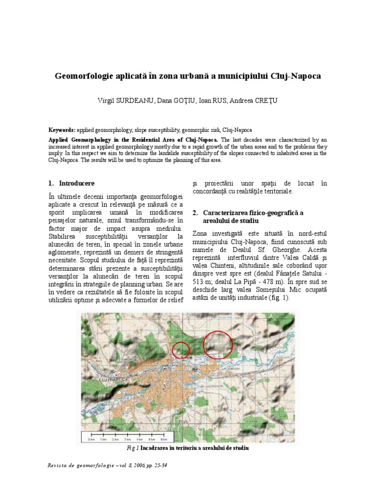 Keywords: applied geomorphology, slope susceptibility, geomorphic risk, Cluj-Napoca Applied Geomorphology in the Residential Area of Cluj- apoca. The last decades were characterized by an increased interest in applied geomorphology mostly due to a rapid growth of the urban areas and to the problems they imply. In this respect we aim to determine the landslide susceptibility of the slopes connected to inhabited areas in the Cluj-Napoca. The results will be used to optimize the planning of this area.