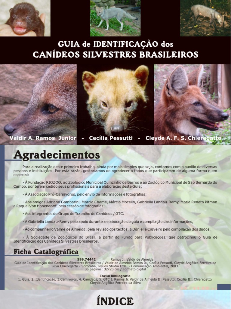 Guia de Identificação dos Canídeos Silvestres Brasileiros / Valdir de Almeida Ramos Jr., Cecília Pessutti, Cleyde Angélica Ferreira da Silva Chieregatto - Sorocaba, JoyJoy Studio Ltda. - Comunicação Ambiental, 2003. 35 páginas: 32x20 cm / Formato digital
