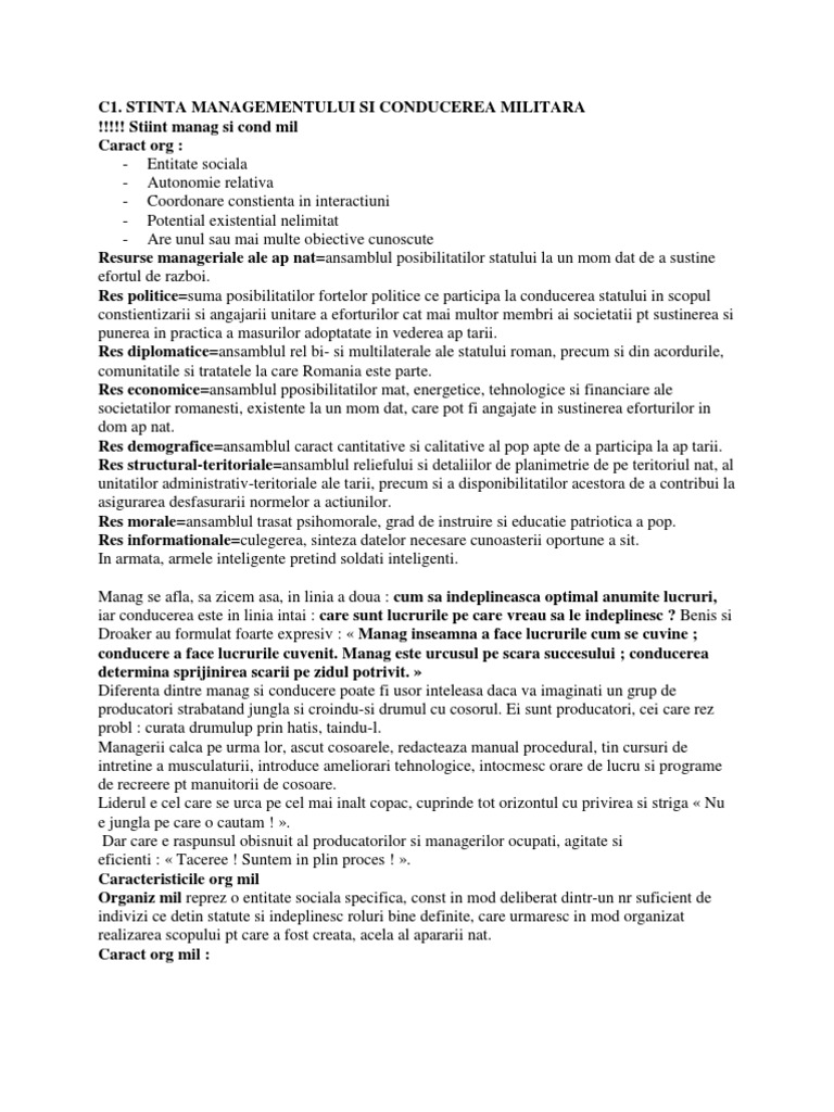 Stiint manag si cond mil Caract org : - Entitate sociala - Autonomie relativa - Coordonare constienta in interactiuni - Potential existential nelimitat - Are unul sau mai multe obiective cunoscute Resurse manageriale ale ap nat=ansamblul posibilitatilor statului la un mom dat de a sustine efortul de razboi. Res politice=suma posibilitatilor fortelor politice ce participa la conducerea statului in scopul constientizarii si angajarii unitare a eforturilor cat mai multor membri ai societatii pt sustinerea si punerea in practica a masurilor adoptatate in vederea ap tarii. Res diplomatice=ansamblul rel bi- si multilaterale ale statului roman, precum si din acordurile, comunitatile si tratatele la care Romania este parte. Res economice=ansamblul pposibilitatilor mat, energetice, tehnologice si financiare ale societatilor romanesti, existente la un mom dat, care pot fi angajate in sustinerea eforturilor in dom ap nat. Res demografice=ansamblul caract cantitative si calitative al pop apte de a participa la ap tarii. Res structural-teritoriale=ansamblul reliefului si detaliilor de planimetrie de pe teritoriul nat, al unitatilor administrativ-teritoriale ale tarii, precum si a disponibilitatilor acestora de a contribui la asigurarea desfasurarii normelor a actiunilor. Res morale=ansamblul trasat psihomorale, grad de instruire si educatie patriotica a pop. Res informationale=culegerea, sinteza datelor necesare cunoasterii oportune a sit. In armata, armele inteligente pretind soldati inteligenti. Manag se afla, sa zicem asa, in linia a doua : cum sa indeplineasca optimal anumite lucruri, iar conducerea este in linia intai : care sunt lucrurile pe care vreau sa le indeplinesc ? Benis si Droaker au formulat foarte expresiv : Manag inseamna a face lucrurile cum se cuvine ; conducere a face lucrurile cuvenit. Manag este urcusul pe scara succesului ; conducerea determina sprijinirea scarii pe zidul potrivit. Diferenta dintre manag si conducere poate fi usor inteleasa daca va imaginati un grup de producatori strabatand jungla si croindu-si drumul cu cosorul. Ei sunt producatori, cei care rez probl : curata drumulup prin hatis, taindu-l. Managerii calca pe urma lor, ascut cosoarele, redacteaza manual procedural, tin cursuri de intretine a musculaturii, introduce ameliorari tehnologice, intocmesc orare de lucru si programe de recreere pt manuitorii de cosoare. Liderul e cel care se urca pe cel mai inalt copac, cuprinde tot orizontul cu privirea si striga Nu e jungla pe care o cautam ! . Dar care e raspunsul obisnuit al producatorilor si managerilor ocupati, agitate si eficienti : Taceree ! Suntem in plin proces ! . Caracteristicile org mil Organiz mil reprez o entitate sociala specifica, const in mod deliberat dintr-un nr suficient de indivizi ce detin statute si indeplinesc roluri bine definite, care urmaresc in mod organizat realizarea scopului pt care a fost creata, acela al apararii nat. Caract org mil :