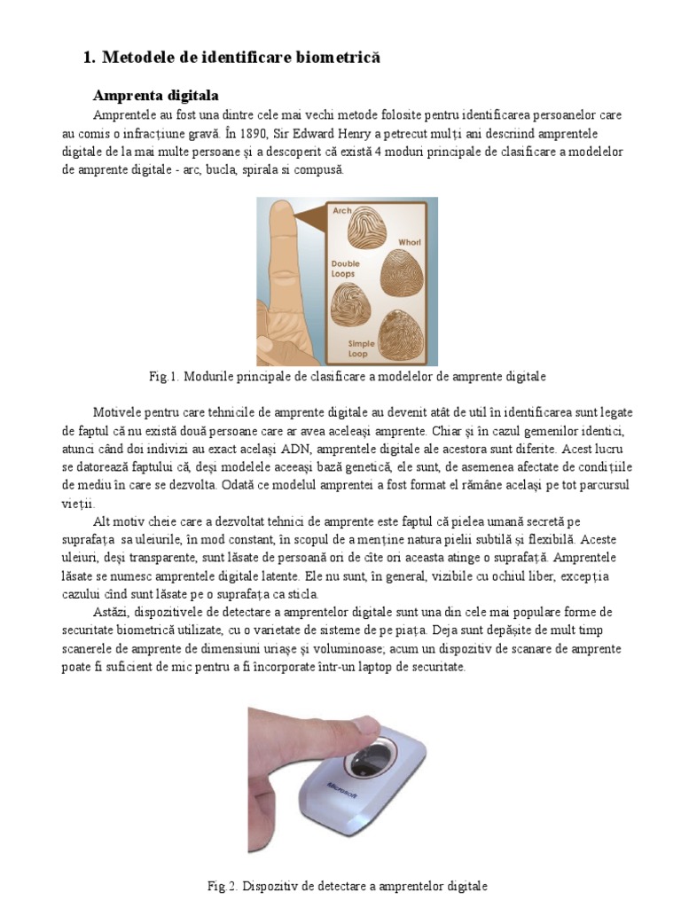 Fig.1. Modurile principale de clasificare a modelelor de amprente digitale Motivele pentru care tehnicile de amprente digitale au devenit att de util n identificarea sunt legate de faptul c nu exist dou persoane care ar avea aceleai amprente. Chiar i n cazul gemenilor identici, atunci cnd doi indivizi au exact acelai ADN, amprentele digitale ale acestora sunt diferite. Acest lucru se datoreaz faptului c, dei modelele aceeai baz genetic, ele sunt, de asemenea afectate de condiiile de mediu n care se dezvolta. Odat ce modelul amprentei a fost format el rmne acelai pe tot parcursul vieii. Alt motiv cheie care a dezvoltat tehnici de amprente este faptul c pielea uman secret pe suprafaa sa uleiurile, n mod constant, n scopul de a menine natura pielii subtil i flexibil. Aceste uleiuri, dei transparente, sunt lsate de persoan ori de cte ori aceasta atinge o suprafa. Amprentele lsate se numesc amprentele digitale latente. Ele nu sunt, n general, vizibile cu ochiul liber, excepia cazului cnd sunt lsate pe o suprafaa ca sticla. Astzi, dispozitivele de detectare a amprentelor digitale sunt una din cele mai populare forme de securitate biometric utilizate, cu o varietate de sisteme de pe piaa. Deja sunt depite de mult timp scanerele de amprente de dimensiuni uriae i voluminoase; acum un dispozitiv de scanare de amprente poate fi suficient de mic pentru a fi ncorporate ntr-un laptop de securitate.