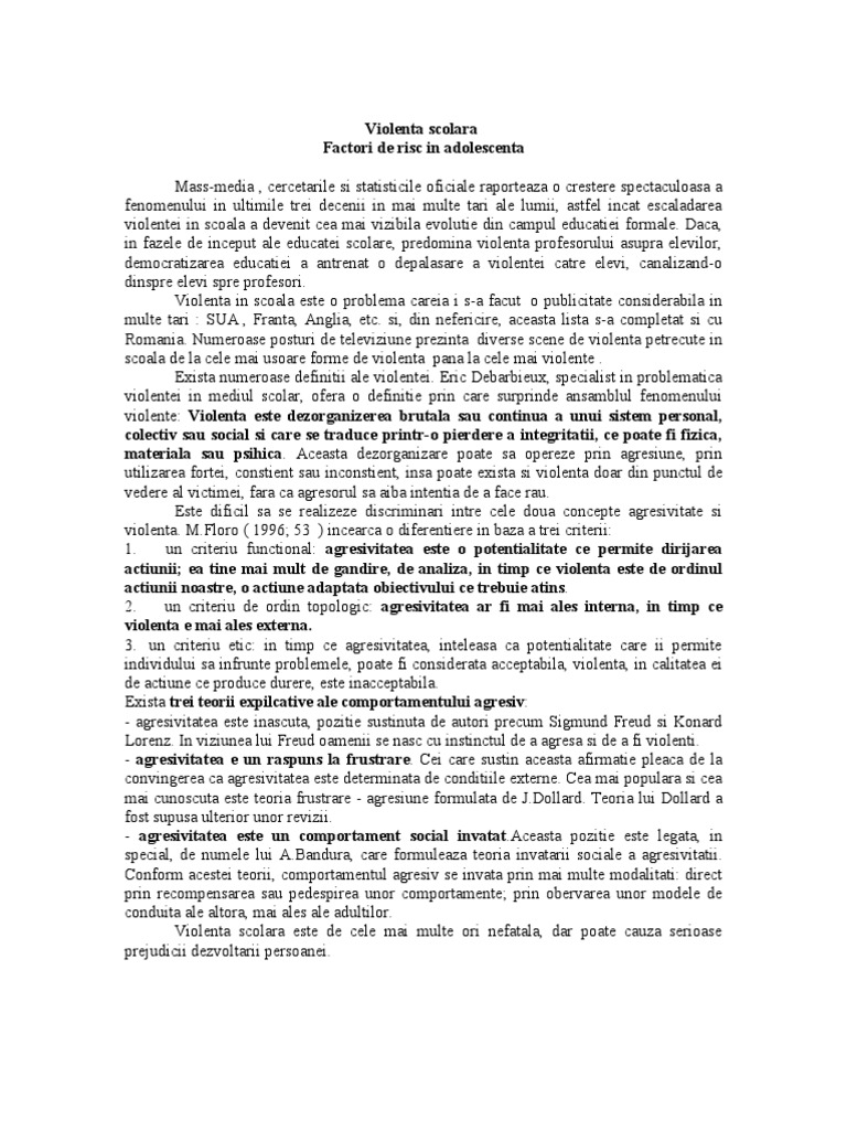 decenii in mai multe tari ale lumii, astfel incat escaladarea violentei in scoala a devenit cea mai vizibila evolutie din campul educatiei formale. Daca, in fazele de inceput ale educatei scolare, predomina violenta profesorului asupra elevilor, democratizarea educatiei a antrenat o depalasare a violentei catre elevi, canalizand-o dinspre elevi spre profesori. Violenta in scoala este o problema careia i s-a facut o publicitate considerabila in multe tari : SUA , Franta, Anglia, etc. si, din nefericire, aceasta lista s-a completat si cu Romania. Numeroase posturi de televiziune prezinta diverse scene de violenta petrecute in scoala de la cele mai usoare forme de violenta pana la cele mai violente . Exista numeroase definitii ale violentei. Eric Debarbieux, specialist in problematica violentei in mediul scolar, ofera o definitie prin care surprinde ansamblul fenomenului violente: Violenta este dezorganizerea brutala sau continua a unui sistem personal, colectiv sau social si care se traduce printr-o pierdere a integritatii, ce poate fi fizica, materiala sau psihica. Aceasta dezorganizare poate sa opereze prin agresiune, prin utilizarea fortei, constient sau inconstient, insa poate exista si violenta doar din punctul de vedere al victimei, fara ca agresorul sa aiba intentia de a face rau. Este dificil sa se realizeze discriminari intre cele doua concepte agresivitate si violenta. [Link] ( 1996; 53 ) incearca o diferentiere in baza a trei criterii: 1. un criteriu functional: agresivitatea este o potentialitate ce permite dirijarea actiunii; ea tine mai mult de gandire, de analiza, in timp ce violenta este de ordinul actiunii noastre, o actiune adaptata obiectivului ce trebuie atins. 2. un criteriu de ordin topologic: agresivitatea ar fi mai ales interna, in timp ce violenta e mai ales externa. 3. un criteriu etic: in timp ce agresivitatea, inteleasa ca potentialitate care ii permite individului sa infrunte problemele, poate fi considerata acceptabila, violenta, in calitatea ei de actiune ce produce durere, este inacceptabila. Exista trei teorii expilcative ale comportamentului agresiv: - agresivitatea este inascuta, pozitie sustinuta de autori precum Sigmund Freud si Konard Lorenz. In viziunea lui Freud oamenii se nasc cu instinctul de a agresa si de a fi violenti. - agresivitatea e un raspuns la frustrare. Cei care sustin aceasta afirmatie pleaca de la convingerea ca agresivitatea este determinata de conditiile externe. Cea mai populara si cea mai cunoscuta este teoria frustrare - agresiune formulata de [Link]. Teoria lui Dollard a fost supusa ulterior unor revizii. - agresivitatea este un comportament social [Link] pozitie este legata, in special, de numele lui [Link], care formuleaza teoria invatarii sociale a agresivitatii. Conform acestei teorii, comportamentul agresiv se invata prin mai multe modalitati: direct prin recompensarea sau pedespirea unor comportamente; prin obervarea unor modele de conduita ale altora, mai ales ale adultilor. Violenta scolara este de cele mai multe ori nefatala, dar poate cauza serioase prejudicii dezvoltarii persoanei.