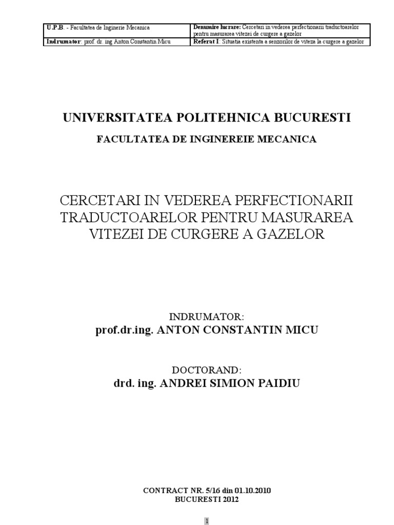 Denumire lucrare: Cercetari in vederea perfectionarii traductoarelor pentru masurarea vitezei de curgere a gazelor Referat I: Situatia existenta a senzorilor de viteza la curgere a gazelor