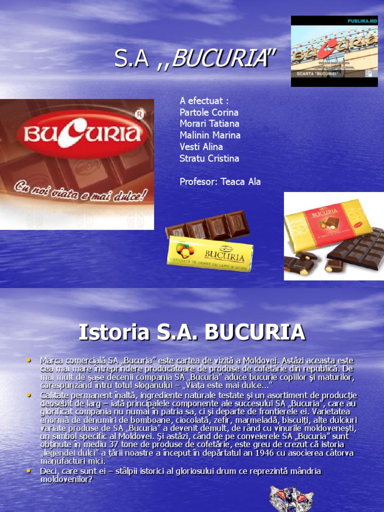 ntreprinderea S.A. Bucuria, bogat n tradiii, este capabil de a drui clipe dulci fiecruia pentru fiecare zi, pentru fiecare minut, pentru fericirea fiecruia. Bucuria reprezint unatelier de arte rafinate, unde ca material servete ciocolata excelent i ingredientele unice. Misiunea principal a companiei rezid n denumirea ei - Bucuria! Compania este destinata s druie bucurie oamenilor! ns aceasta nu e tot! Mai detaliat despre misiunile companiei: A propaganda produse sntoase i calitative A crea adevrate opere de ciocolat A anticipa ateptrilor iubitorilor de dulciuri A lucra, a ne dezvolta i a drui oamenilor srbtoare A propune un produs perfect i o deservire comod A fi alturi n cele mai importante momente ale vieii Dumneavoastr A proslvi ciocolata moldoveneasc nu numai n ar, ci i peste hotarele ei. Putem vorbi i scrie la nesfrit despre aceasta, ns cea mai mare dorin a noastr este cel carea ncercat ciocolata noastr s zmbeasc, s priveasc lumea cu mai mult optimism i ncredere;ca producia noastr s devin acea cutie de ciocolate pe care tatl fericito va nmna mpreuncu un buchet de flori medicului obstetrician; cutia pe care elevii o vor nmna nvtoarei lor preferate deja n vrst; acea cutie n care fiecare bomboan va aminti despre ceva plcut i drag..