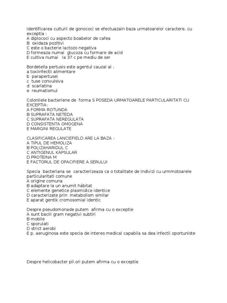o bacterie lactozo negativa D formeaza numai glucoza cu formare de acid E cultiva numai la 37 c pe mediu de ser Bordetella pertusis este agentul cauzal al : a toxiinfectii alimentare b parapertusei c tuse convulsiva d scarlatina e reumatismul Coloniiele bacteriene de forma S POSEDA URMATOARELE PARTICULARITATI CU EXCEPTIA: A FORMA ROTUNDA B SUPRAFATA NETEDA C SUPRAFATA NEREGULATA D CONSISTENTA OMOGENA E MARGINI REGULATE CLASIFICAREA LANCIEFIELD ARE LA BAZA : A TIPUL DE HEMOLIZA B POLIZAHARIDUL C C ANTIGENUL KAPSULAR D PROTEINA M E FACTORUL DE OPACIFIERE A SERULUI Specia bacteriana se caracterizeaza ca o totalitate de indivizi cu urmmotoarele particularitati comune A origine comuna B adaptare la un anumit hbitat C elemente genetice plasmidice identice D caracterizate prin metabolism similar E aparat gentik cromosomial identic Despre pseudomonade putem afirma cu o exceptie A sunt bacili gram negativi subtiri B mobile C sporulati D strict aerobi E p. aeruginosa este specia de interes medical capabila sa dea infectii oportuniste
