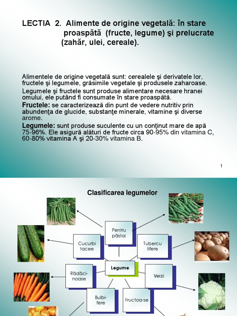 LECTIA 2. Alimente de origine vegetal: n stare proaspt (fructe, legume) i prelucrate (zahr, ulei, cereale).