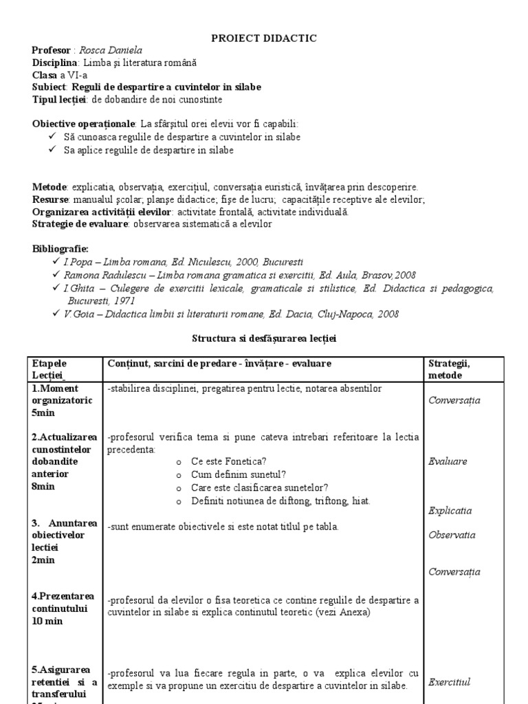 in silabe Tipul leciei: de dobandire de noi cunostinte Obiective operaionale: La sfritul orei elevii vor fi capabili: S cunoasca regulile de despartire a cuvintelor in silabe Sa aplice regulile de despartire in silabe Metode: explicatia, observaia, exerciiul, conversaia euristic, nvarea prin descoperire. Resurse: manualul colar; plane didactice; fie de lucru; capacitile receptive ale elevilor; Organizarea activitii elevilor: activitate frontal, activitate individual. Strategie de evaluare: observarea sistematic a elevilor Bibliografie: [Link] Limba romana, Ed. Niculescu, 2000, Bucuresti Ramona Radulescu Limba romana gramatica si exercitii, Ed. Aula, Brasov,2008 [Link] Culegere de exercitii lexicale, gramaticale si stilistice, Ed. Didactica si pedagogica, Bucuresti, 1971 [Link] Didactica limbii si literaturii romane, Ed. Dacia, Cluj-Napoca, 2008 Structura si desfurarea leciei Etapele Leciei [Link] organizatoric 5min Coninut, sarcini de predare - nvare - evaluare -stabilirea disciplinei, pregatirea pentru lectie, notarea absentilor Conversaia Strategii, metode