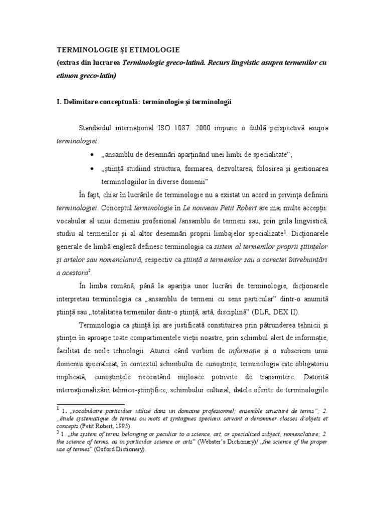 TERMINOLOGIE I ETIMOLOGIE (extras din lucrarea Terminologie greco-latin. Recurs lingvistic asupra termenilor cu etimon greco-latin) I.