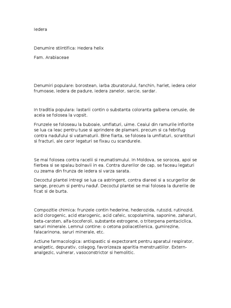 Compozitie chimica: frunzele contin hederine, hederozida, rutozid, rutinozid, acid clorogenic, acid etarogenic, acid cafeic, scopolamina, saponine, zaharuri, beta-caroten, alfa-tocoferoli, substante estrogene, o triterpena pentaciclica, saruri minerale. Lemnul contine: o cetona poliacetilenica, gumirezine, falacarinona, saruri minerale, etc. Actiune farmacologica: antispastic si expectorant pentru aparatul respirator, analgetic, depurativ, colagog, favorizeaza aparitia menstruatiilor. Externanalgezic, vulnerar, vasoconstrictor si hemolitic.