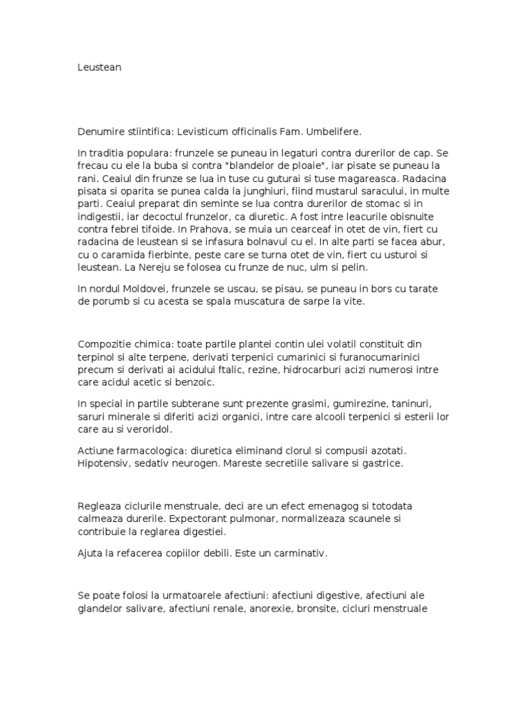 Denumire stiintifica: Levisticum officinalis Fam. Umbelifere. In traditia populara: frunzele se puneau in legaturi contra durerilor de cap. Se frecau cu ele la buba si contra "blandelor de ploaie", iar pisate se puneau la rani. Ceaiul din frunze se lua in tuse cu guturai si tuse magareasca. Radacina pisata si oparita se punea calda la junghiuri, fiind mustarul saracului, in multe parti. Ceaiul preparat din seminte se lua contra durerilor de stomac si in indigestii, iar decoctul frunzelor, ca diuretic. A fost intre leacurile obisnuite contra febrei tifoide. In Prahova, se muia un cearceaf in otet de vin, fiert cu radacina de leustean si se infasura bolnavul cu el. In alte parti se facea abur, cu o caramida fierbinte, peste care se turna otet de vin, fiert cu usturoi si leustean. La Nereju se folosea cu frunze de nuc, ulm si pelin. In nordul Moldovei, frunzele se uscau, se pisau, se puneau in bors cu tarate de porumb si cu acesta se spala muscatura de sarpe la vite.