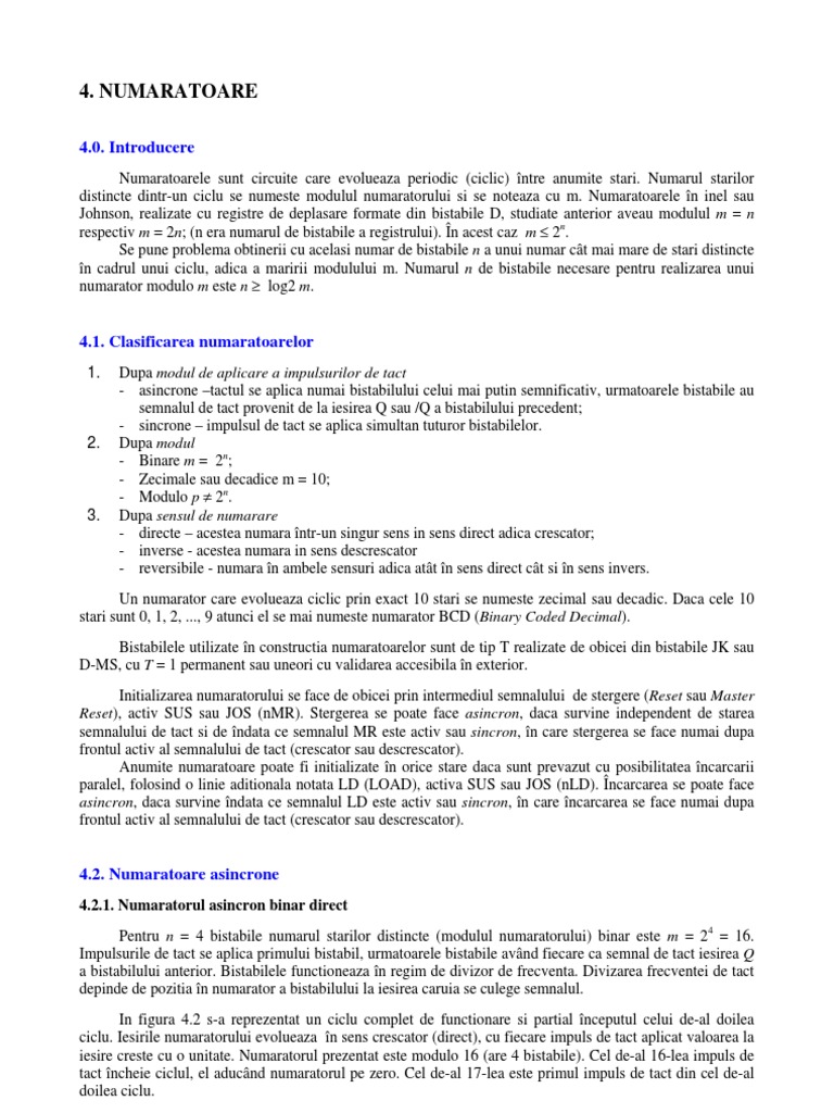 Numaratoarele sunt circuite care evolueaza periodic (ciclic) ntre anumite stari. Numarul starilor distincte dintr-un ciclu se numeste modulul numaratorului si se noteaza cu m. Numaratoarele n inel sau Johnson, realizate cu registre de deplasare formate din bistabile D, studiate anterior aveau modulul m = n respectiv m = 2n; (n era numarul de bistabile a registrului). n acest caz m 2n. Se pune problema obtinerii cu acelasi numar de bistabile n a unui numar ct mai mare de stari distincte n cadrul unui ciclu, adica a maririi modulului m. Numarul n de bistabile necesare pentru realizarea unui numarator modulo m este n log2 m.