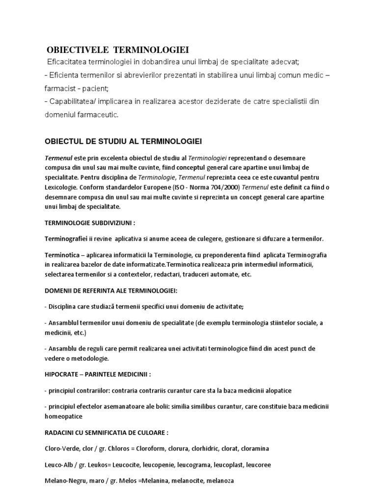In Grecia antica existau medici-farmacisti denumiti iatros, care isi desfasurau activitatea in spatiul denumit iatreion = oficina medicala, iar remediile medicale erau pastrate intr-o incapere special amenajata denumita apothiki = camera, depozit. Termenul apothiki , grec., apoticarius, lat., se regaseste si in prezent intr-o forma mai mult sau mai putin modificata, in diferite culturi : MEDICAMENT (DROG) Origine: Medicamentum, medicamen, -inis, lat. = leac, medicament, remediu (termen cu utilizare restransa in prezent fiind folosit in special in homeopatie). Acesti termeni au dat in antichitate derivate: - Ars medicamentaria = Farmacopee - Medicamentarius = farmacist Definitie: - Substanta sau amestec de substante care au proprietati preventive/ curative pentru bolile umane si veterinare, ca si orice produs care poate fi administrat la om sau animale in scop de diagnostic sau de corectare, remediere, restaurare sau modificare a functiilor organice ale organismului MEDICATIE Origine: Medicatio, -onis, lat. = medicatie, intrebuintarea doctoriilor, vindecare Definitie: termen care defineste o actiune de utilizare sistematica a unuia sau mai multor agenti terapeutici cu indicatie bine precizata, cu scopul ameliorarii sau eradicarii unui simptom / disfunctie / anomalie, organice sau biologice sau al vindecarii unei maladii.. TRATAMENT Origine: Tractare, traheo, -ere, -traxi, tractum, lat. = a targe, a forta, a tar; a actiona impotriva cuiva/ceva dar si de a convinge. Definitie: Termen definit ca un complex de prescriptii medicale, igienico-dietetice si de conduita terapeutica utilizate cu scopul de vindecare, ameliorare, scurtare a duratei bolii sau in general ca totalitatea mijloacelor medicale, igienico-sanitare prescrise pentru combaterea efectelor unei maladii REMEDIU Origine: Remedium, lat. = leac, medicament Definitie: Orice mijloc/actiune/factor utilizate in tratamentul curativ/paleativ al unei bolii. TERMENI REFERITORI LA CELULE, TESUTURI, ORGANE CELULA Radacina cito-: Origine: Kytos, gr. = celula; termenul este utilizat uneori si ca sufix. -Citobiologie = cito, gr. = celula + bios, gr. + logos, gr. = viata; reprezinta ramura a stiintelor medicale care se ocupa cu studiul biologiei celulare;