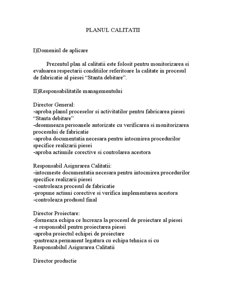 la calitate in procesul de fabricatie al piesei Stanta debitare. II)Responsabilitatile managementului Director General: -aproba planul proceselor si activitatilor pentru fabricarea piesei Stanta debitare -desemneaza persoanele autorizate cu verificarea si monitorizarea procesului de fabricatie -aproba documentatia necesara pentru intocmirea procedurilor specifice realizarii piesei -aproba actiunile corective si controlarea acestora Responsabil Asigurarea Calitatii: -intocmeste documentatia necesara pentru intocmirea procedurilor specifice realizarii piesei -controleaza procesul de fabricatie -propune actiuni corective si verifica implementarea acestora -controleaza produsul final Director Proiectare: -formeaza echipa ce lucreaza la procesul de proiectare al piesei -e responsabil pentru proiectarea piesei -aproba proiectul echipei de proiectare -pastreaza permanent legatura cu echipa tehnica si cu Responsabilul Asigurarea Calitatii Director productie