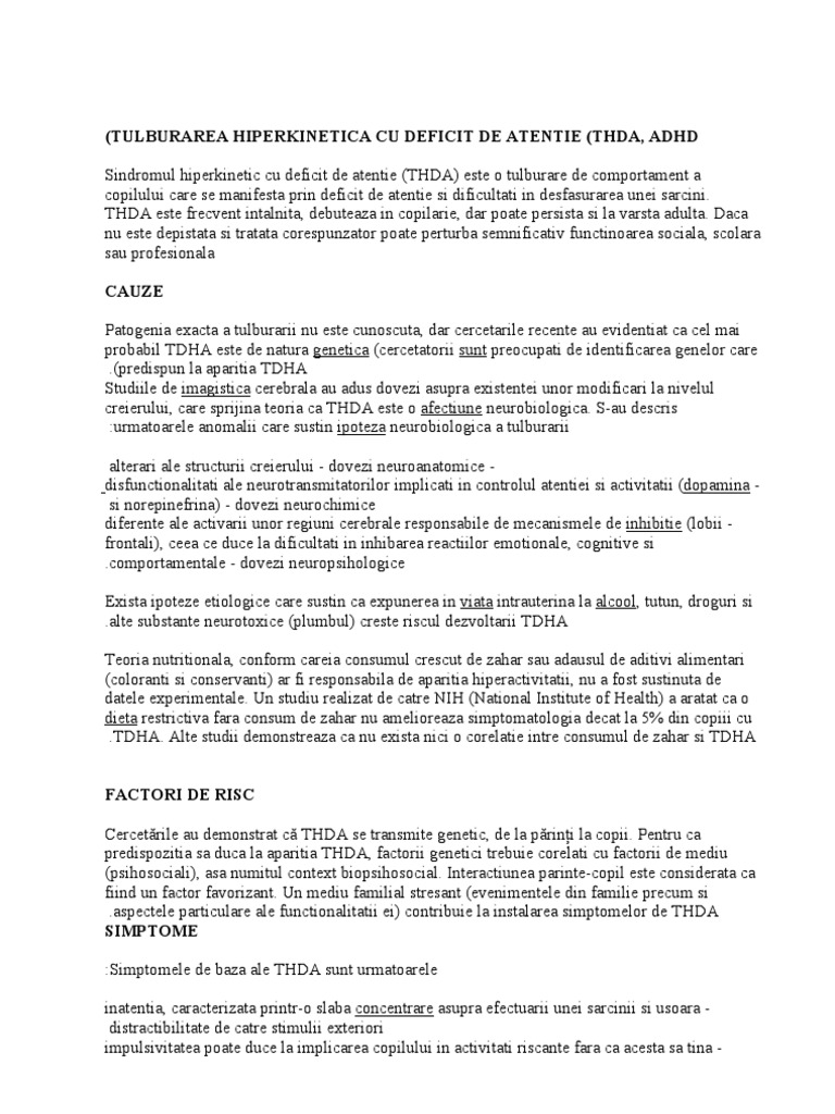 care se manifesta prin deficit de atentie si dificultati in desfasurarea unei sarcini. THDA este frecvent intalnita, debuteaza in copilarie, dar poate persista si la varsta adulta. Daca nu este depistata si tratata corespunzator poate perturba semnificativ functinoarea sociala, scolara sau profesionala CAUZE Patogenia exacta a tulburarii nu este cunoscuta, dar cercetarile recente au evidentiat ca cel mai probabil TDHA este de natura genetica (cercetatorii sunt preocupati de identificarea genelor care .(predispun la aparitia TDHA Studiile de imagistica cerebrala au adus dovezi asupra existentei unor modificari la nivelul creierului, care sprijina teoria ca THDA este o afectiune neurobiologica. S-au descris :urmatoarele anomalii care sustin ipoteza neurobiologica a tulburarii alterari ale structurii creierului - dovezi neuroanatomice disfunctionalitati ale neurotransmitatorilor implicati in controlul atentiei si activitatii (dopamina si norepinefrina) - dovezi neurochimice diferente ale activarii unor regiuni cerebrale responsabile de mecanismele de inhibitie (lobii frontali), ceea ce duce la dificultati in inhibarea reactiilor emotionale, cognitive si .comportamentale - dovezi neuropsihologice Exista ipoteze etiologice care sustin ca expunerea in viata intrauterina la alcool, tutun, droguri si .alte substante neurotoxice (plumbul) creste riscul dezvoltarii TDHA Teoria nutritionala, conform careia consumul crescut de zahar sau adausul de aditivi alimentari (coloranti si conservanti) ar fi responsabila de aparitia hiperactivitatii, nu a fost sustinuta de datele experimentale. Un studiu realizat de catre NIH (National Institute of Health) a aratat ca o dieta restrictiva fara consum de zahar nu amelioreaza simptomatologia decat la 5% din copiii cu .TDHA. Alte studii demonstreaza ca nu exista nici o corelatie intre consumul de zahar si TDHA FACTORI DE RISC Cercetrile au demonstrat c THDA se transmite genetic, de la prini la copii. Pentru ca predispozitia sa duca la aparitia THDA, factorii genetici trebuie corelati cu factorii de mediu (psihosociali), asa numitul context biopsihosocial. Interactiunea parinte-copil este considerata ca fiind un factor favorizant. Un mediu familial stresant (evenimentele din familie precum si .aspectele particulare ale functionalitatii ei) contribuie la instalarea simptomelor de THDA SIMPTOME :Simptomele de baza ale THDA sunt urmatoarele inatentia, caracterizata printr-o slaba concentrare asupra efectuarii unei sarcinii si usoara distractibilitate de catre stimulii exteriori impulsivitatea poate duce la implicarea copilului in activitati riscante fara ca acesta sa tina -