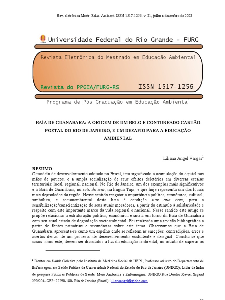 Liliana Angel Vargas1 RESUMO O modelo de desenvolvimento adotado no Brasil, tem significado a acumulao do capital nas mos de poucos, e a ampla socializao de seus efeitos deletrios em diversas escalas territoriais: local, regional, nacional. No Rio de Janeiro, um dos exemplos mais significativos a Baa de Guanabara, ou seio do mar, na lngua Tupi, e que hoje representa um dos locais mais degradados da regio. Nesse sentido resgatar a importncia poltica, econmica, cultural, simblica, e sociaoambiantal desta baa condio sine qua nom, para a sensibilizao/conscientizao de seus atuais moradores, a partir do estmulo solidariedade e respeito com este importante marco da vida regional e nacional. Nesse sentido este artigo se prope relacionar a estruturao poltica, econmica e social em torno da Baa de Guanabara com seu atual estado de degradao socioambiental. Foi realizada uma reviso bibliogrfica a partir de fontes primrias e secundarias sobre este tema. Observamos que a Baa de Guanabara, apresenta-se como um espelho onde se refletem as emoes, contradies, erros e acertos dentro de um processo de desenvolvimento excludente e desigual. Conclui-se que casos como este, devem ser discutidos luz da educao ambiental, no intuito de superar os
