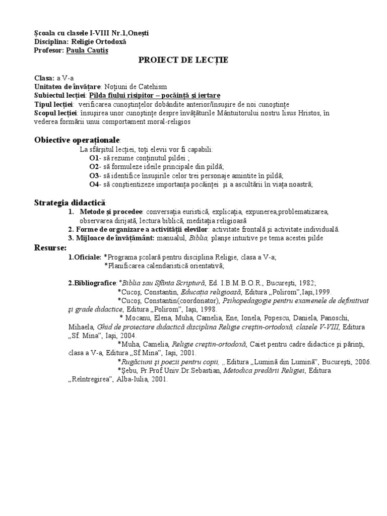 Clasa: a V-a Unitatea de nvare: Noiuni de Catehism Subiectul leciei: Pilda fiului risipitor pocin i iertare Tipul leciei: verificarea cunotinelor dobndite anterior/nsuire de noi cunotine Scopul leciei: nsuirea unor cunotine despre nvturile Mntuitorului nostru Iisus Hristos, n vederea formrii unui comportament moral-religios