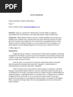 Daca doriti sa citati aceasta pagina in alte publicatii web sau reviste (nu mai mult de 10 randuri) trebuie sa mentio "roEnciclopedia - prima enciclopedie romana online, Literatur, "1907" (Volumul), [Link] conceput de Ioana Radu i s trimitei un e-mail la adresa office@roenciclopedi a primi acordul roEnciclopedia. Acasa Selectare domeniu Cautare Contact Copyright 2002-2007 roEnciclopedia. Toate drepturile rezervate. Termeni si conditii. Webmistress: Ioana Radu Tudor Arghezi universul poetic Poezia filozofica argheziana se adapa din singuratatea, ca fiinta ganditoare, omului pe pamant. Sursa ei se afla in permanenta cautare a unui Dumnezeu, care refuza a se arata si determina o stare sufleteasca caracterizata de permanenta pendulare intre credinta si tagada. Reprezentativi pentru aceasta tema a liricii argheziene sunt Psalmii, in care poetul accepta si refuza succesiv existenta dumenzeirii: Vreau sa te pipai si sa urlu: Este!. Conceptia artistica a lui Arghezi, asa cum se contureaza ea inca de la inceput, este una de angajare sociala. Marele poem ciclic din 1956 Cantare omului este o sociogonie urmarind evolutia omului din momentul ridicarii in picioare, pana la dscoperirea tainei tainelor, atomul. Volumul 1907 Peisaje (1955) evoca marea zguduire sociala din Romania de la inceputul veacului. In fine, sa nu uitam proza, fie cea pamfletara, fie cea romanesca, avand un si mai vadit