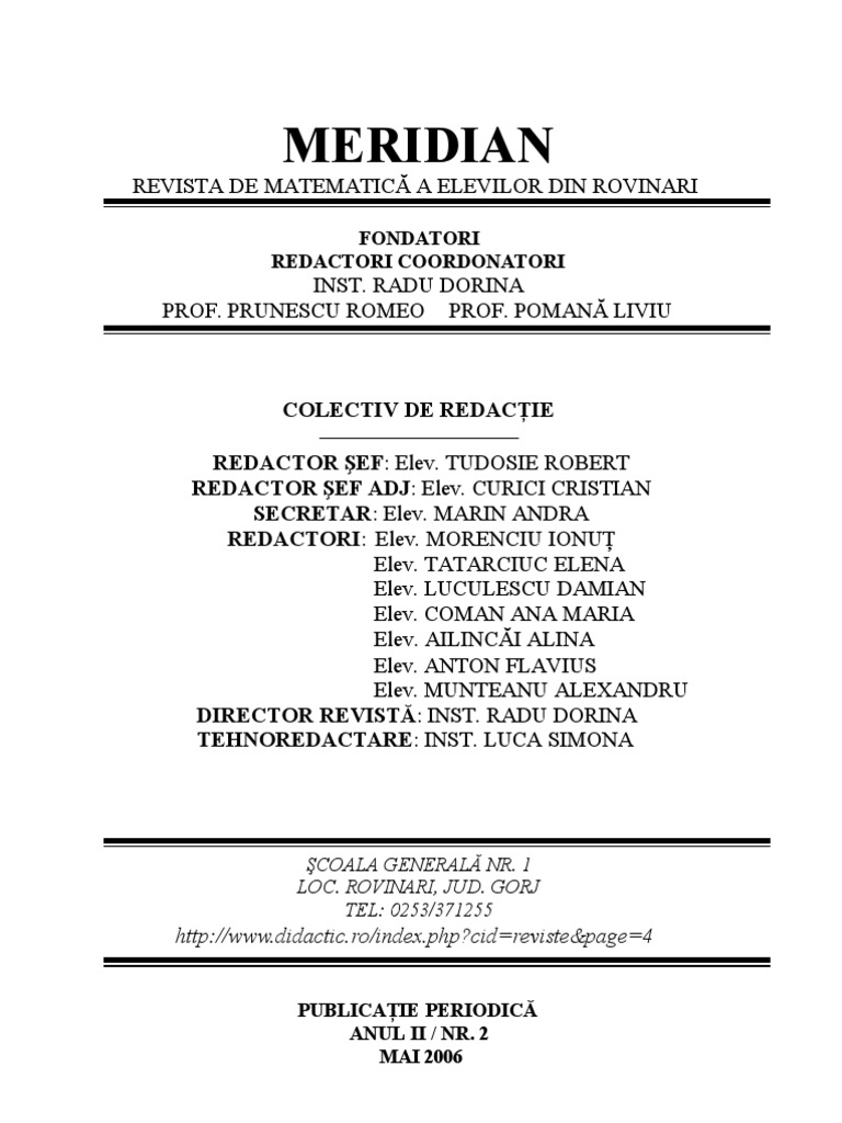 COLECTIV DE REDACIE REDACTOR EF: Elev. TUDOSIE ROBERT REDACTOR EF ADJ: Elev. CURICI CRISTIAN SECRETAR: Elev. MARIN ANDRA REDACTORI: Elev. MORENCIU IONU Elev. TATARCIUC ELENA Elev. LUCULESCU DAMIAN Elev. COMAN ANA MARIA Elev. AILINCI ALINA Elev. ANTON FLAVIUS Elev. MUNTEANU ALEXANDRU DIRECTOR REVIST: INST. RADU DORINA TEHNOREDACTARE: INST. LUCA SIMONA