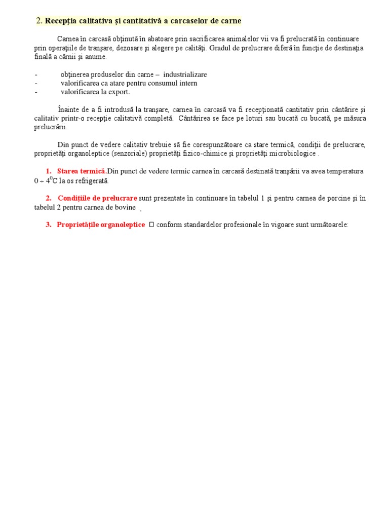 nainte de a fi introdus la tranare, carnea n carcas va fi recepionat cantitativ prin cntrire i calitativ printr-o recepie calitativ complet. Cntrirea se face pe loturi sau bucat cu bucat, pe msura prelucrrii. Din punct de vedere calitativ trebuie s fie corespunztoare ca stare termic, condiii de prelucrare, proprieti organoleptice (senzoriale) proprieti fizico-chimice i proprieti microbiologice . 1. Starea [Link] punct de vedere termic carnea n carcas destinat tranrii va avea temperatura 0 40C la os refrigerat. 2. Condiiile de prelucrare sunt prezentate n continuare n tabelul 1 i pentru carnea de porcine i n tabelul 2 pentru carnea de bovine 3. Proprietile organoleptice conform standardelor profesionale n vigoare sunt urmtoarele: