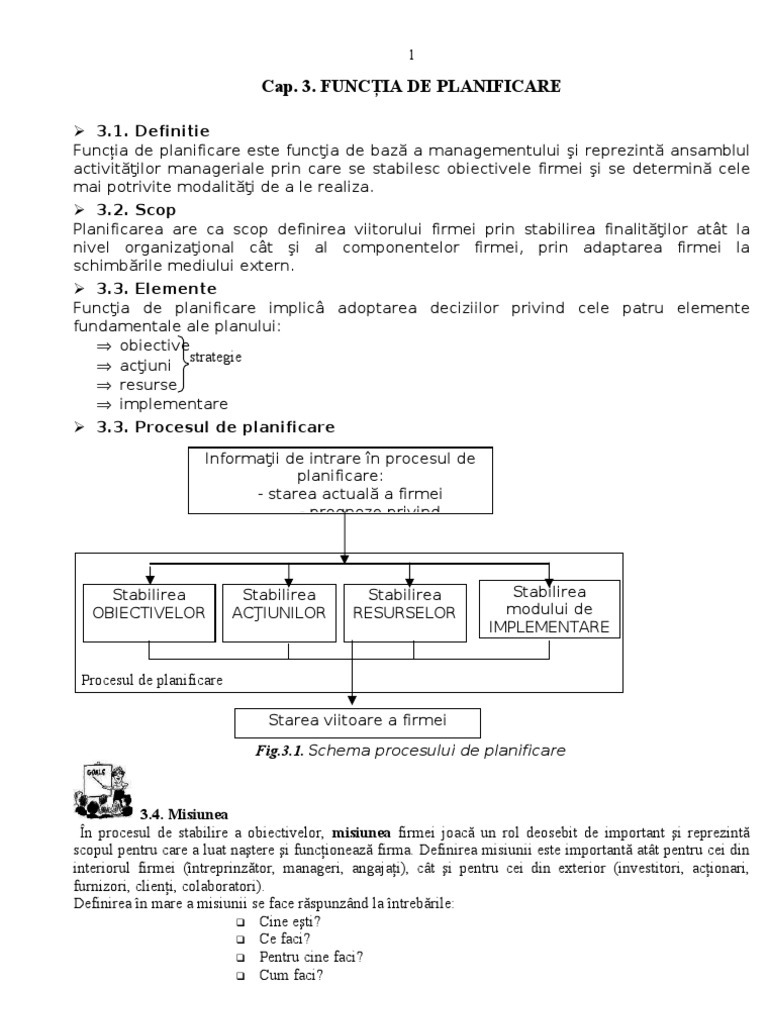 3.1. Definitie Funcia de planificare este funcia de baz a managementului i reprezint ansamblul activitilor manageriale prin care se stabilesc obiectivele firmei i se determin cele mai potrivite modaliti de a le realiza. 3.2. Scop Planificarea are ca scop definirea viitorului firmei prin stabilirea finalitilor att la nivel organizaional ct i al componentelor firmei, prin adaptarea firmei la schimbrile mediului extern. 3.3. Elemente Funcia de planificare implic adoptarea deciziilor privind cele patru elemente fundamentale ale planului: obiective strategie aciuni resurse implementare 3.3. Procesul de planificare Informaii de intrare n procesul de planificare: - starea actual a firmei - prognoze privind