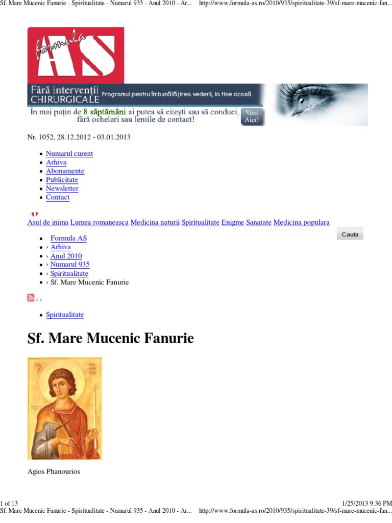 Nr. 1052, 28.12.2012 - 03.01.2013 Numarul curent Arhiva Abonamente Publicitate Newsletter Contact Asul de inima Lumea romaneasca Medicina naturii Spiritualitate Enigme Sanatate Medicina populara Formula AS Arhiva Anul 2010 Numarul 935 Spiritualitate Sf. Mare Mucenic Fanurie