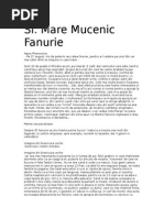 Sf. Fanurie Vazand minunea, multimea i-a cazut la picioare. Cat de mult il iubea Dumnezeu pe Fanurie? Ostasul nebiruit al lui Iisus Numai ca si-n aceasta poveste, ca si in viata, Raul - prezent peste tot unde umbla Dumnezeu - trebuia sa strice creatia Lui. O vorba otravita, soptita la ureche, si Fanurie este arestat, invinuit ca a inviat-o pe tanara, ca sa puna mana pe putere... Avea 19 ani! Au fost adusi cei mai rai calai, iar trei din ei au fost trasi la sorti, ca sa-i taie capul. A fost supus la chinuri si torturi de neimaginat: au aruncat cu pietre in trupu-i firav, i-au smuls bucati de piele, dintii, l-au intepat cu sulita, apoi au presarat sare pe rani, i-au taiat degetele de la picioare, l-au ars cu carbuni aprinsi, l-au crestat pe fata - in timp ce-l scuipau si-l batjocoreau. Iar Fanurie il ruga pe Dumnezeu sa-i ierte, si-I multumea ca poate suferi si el, precum Hristos pe cruce. Inainte de-a fi decapitat, Fanurie le-a promis calailor ca cine-i va taia capul va merge cu el, in Rai. Si si-a asezat linistit capul pe butuc. Se zice ca n-a curs sange, ci lapte, iar deasupra tuturor a aparut insusi Sfantul Fanurie, imbracat in armura, cu aura de sfant, cu o lumanare aprinsa in mana dreapta si crucea in stanga.