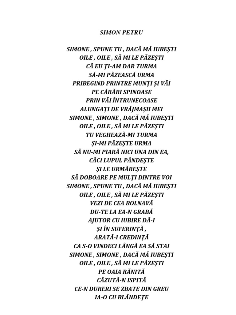 PRIBEGIND PRINTRE MUNI I VI PE CRRI SPINOASE PRIN VI NTRUNECOASE ALUNGAI DE VRJMAII MEI SIMONE , SIMONE , DAC M IUBETI OILE , OILE , S MI LE PZETI TU VEGHEAZ-MI TURMA I-MI PZETE URMA S NU-MI PIAR NICI UNA DIN EA, CCI LUPUL PNDETE I LE URMRETE S DOBOARE PE MULI DINTRE VOI SIMONE , SPUNE TU , DAC M IUBETI OILE , OILE , S MI LE PZETI VEZI DE CEA BOLNAV DU-TE LA EA-N GRAB AJUTOR CU IUBIRE D-I I N SUFERIN , ARAT-I CREDIN CA S-O VINDECI LNG EA S STAI SIMONE , SIMONE , DAC M IUBETI OILE , OILE , S MI LE PZETI PE OAIA RNIT CZUT-N ISPIT CE-N DURERI SE ZBATE DIN GREU IA-O CU BLNDEE