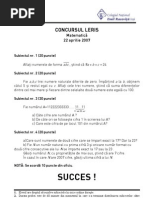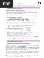 II. La problemele 10, 11 i 12 scrie i rezolvrile complete pe foaia de concurs. 10. Bogdan a primit de la bunicul su o sum de bani, pe care a cheltuit-o n cinci zile astfel: n prima zi a cheltuit o treime din suma, a doua zi un sfert din banii rmai, a treia zi jumtate din noul rest, iar a patra zi dou treimi din suma rmas dup cea de-a treia zi. Afla i c i bani a avut Bogdan la nceput, tiind c n a cincea zi a cheltuit 25 de lei. 11. O alee a unei grdini a fost pavat cu plci de beton n form de ptrat cu latura de jumtate de metru. Plcile, colorate n gri i verde, au fost grupate pe culori astfel (ncepnd de la intrarea n grdina): o plac gri, dou plci verzi, dou plci gri, patru plci verzi, trei plci gri, ase plci verzi i aa mai departe. a) Ce culoare are placa de pe pozi ia a douzeciicincea? b) tiind c ultima grup este format din plci gri, iar numrul plcilor verzi este egal cu 380, afla i lungimea aleei. 12. Maria a primit de ziua ei o cutie cu 38 de bomboane. Ea vrea s termine cutia n patru zile, mncnd n fiecare zi mai multe bomboane dect n ziua precedent. Cte bomboane ar trebui s ia Maria din cutie n fiecare zi, astfel nct numrul celor luate n ultima zi s fie de trei ori mai mare dect numrul celor luate n prima zi? Afla i toate solu iile.