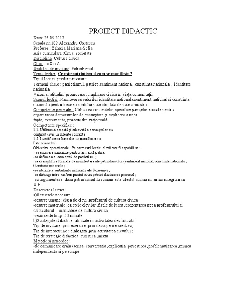 Data: 25.05.2012 Scoala nr.182 Alexandru Costescu Profesor : Zaharia Mariana-Sofia Aria curriculara :Om si societate Disciplina :Cultura civica Clasa : a 8-a A Unitatea de invatare :Patriotismul Tema lectiei: Ce este patriotismul,cum se manifesta? Tipul lectiei :predare-invatare Termeni cheie : patriotismul, patriot ,sentiment national ,constiinta nationala , identitate nationala Valori si atitudini promovate : implicare civic n viaa comunitii Scopul lectiei :Promovarea valorilor identitate nationala,sentiment national si constiinta nationala pentru trezirea simtului patriotic fata de patria noastra Competente generale : Utilizarea conceptelor specifice tiinelor sociale pentru organizarea demersurilor de cunoatere i explicare a unor fapte, evenimente, procese din viaa real Competente specifice :