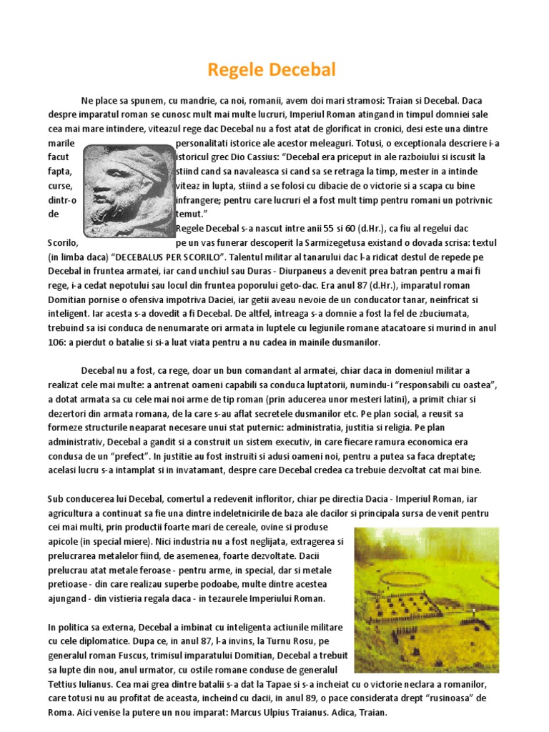 Ne place sa spunem, cu mandrie, ca noi, romanii, avem doi mari stramosi: Traian si Decebal. Daca despre imparatul roman se cunosc mult mai multe lucruri, Imperiul Roman atingand in timpul domniei sale cea mai mare intindere, viteazul rege dac Decebal nu a fost atat de glorificat in cronici, desi este una dintre marile personalitati istorice ale acestor meleaguri. Totusi, o exceptionala descriere i-a facut istoricul grec Dio Cassius: Decebal era priceput in ale razboiului si iscusit la fapta, stiind cand sa navaleasca si cand sa se retraga la timp, mester in a intinde curse, viteaz in lupta, stiind a se folosi cu dibacie de o victorie si a scapa cu bine dintr-o infrangere; pentru care lucruri el a fost mult timp pentru romani un potrivnic de temut. Regele Decebal s-a nascut intre anii 55 si 60 ([Link].), ca fiu al regelui dac Scorilo, pe un vas funerar descoperit la Sarmizegetusa existand o dovada scrisa: textul (in limba daca) DECEBALUS PER SCORILO. Talentul militar al tanarului dac l-a ridicat destul de repede pe Decebal in fruntea armatei, iar cand unchiul sau Duras - Diurpaneus a devenit prea batran pentru a mai fi rege, i-a cedat nepotului sau locul din fruntea poporului geto-dac. Era anul 87 ([Link].), imparatul roman Domitian pornise o ofensiva impotriva Daciei, iar getii aveau nevoie de un conducator tanar, neinfricat si inteligent. Iar acesta s-a dovedit a fi Decebal. De altfel, intreaga s-a domnie a fost la fel de zbuciumata, trebuind sa isi conduca de nenumarate ori armata in luptele cu legiunile romane atacatoare si murind in anul 106: a pierdut o batalie si si-a luat viata pentru a nu cadea in mainile dusmanilor. Decebal nu a fost, ca rege, doar un bun comandant al armatei, chiar daca in domeniul militar a realizat cele mai multe: a antrenat oameni capabili sa conduca luptatorii, numindu-i responsabili cu oastea, a dotat armata sa cu cele mai noi arme de tip roman (prin aducerea unor mesteri latini), a primit chiar si dezertori din armata romana, de la care s-au aflat secretele dusmanilor etc. Pe plan social, a reusit sa formeze structurile neaparat necesare unui stat puternic: administratia, justitia si religia. Pe plan administrativ, Decebal a gandit si a construit un sistem executiv, in care fiecare ramura economica era condusa de un prefect. In justitie au fost instruiti si adusi oameni noi, pentru a putea sa faca dreptate; acelasi lucru s-a intamplat si in invatamant, despre care Decebal credea ca trebuie dezvoltat cat mai bine. Sub conducerea lui Decebal, comertul a redevenit infloritor, chiar pe directia Dacia - Imperiul Roman, iar agricultura a continuat sa fie una dintre indeletnicirile de baza ale dacilor si principala sursa de venit pentru cei mai multi, prin productii foarte mari de cereale, ovine si produse apicole (in special miere). Nici industria nu a fost neglijata, extragerea si prelucrarea metalelor fiind, de asemenea, foarte dezvoltate. Dacii prelucrau atat metale feroase - pentru arme, in special, dar si metale pretioase - din care realizau superbe podoabe, multe dintre acestea ajungand - din vistieria regala daca - in tezaurele Imperiului Roman. In politica sa externa, Decebal a imbinat cu inteligenta actiunile militare cu cele diplomatice. Dupa ce, in anul 87, l-a invins, la Turnu Rosu, pe generalul roman Fuscus, trimisul imparatului Domitian, Decebal a trebuit sa lupte din nou, anul urmator, cu ostile romane conduse de generalul Tettius Iulianus. Cea mai grea dintre batalii s-a dat la Tapae si s-a incheiat cu o victorie neclara a romanilor, care totusi nu au profitat de aceasta, incheind cu dacii, in anul 89, o pace considerata drept rusinoasa de Roma. Aici venise la putere un nou imparat: Marcus Ulpius Traianus. Adica, Traian.