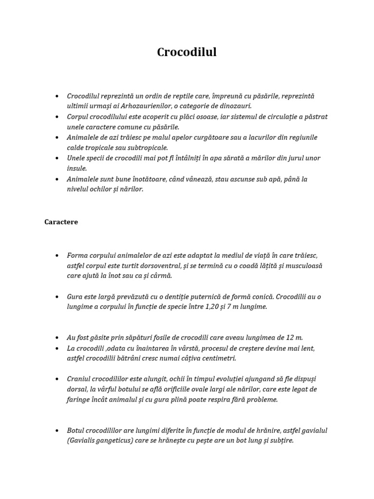 Crocodilul reprezint un ordin de reptile care, mpreun cu psrile, reprezint ultimii urmai ai Arhozaurienilor, o categorie de dinozauri. Corpul crocodilului este acoperit cu plci osoase, iar sistemul de circulaie a pstrat unele caractere comune cu psrile. Animalele de azi triesc pe malul apelor curgtoare sau a lacurilor din regiunile calde tropicale sau subtropicale. Unele specii de crocodili mai pot fi ntlnii n apa srat a mrilor din jurul unor insule. Animalele sunt bune nottoare, cnd vneaz, stau ascunse sub ap, pn la nivelul ochilor i nrilor.