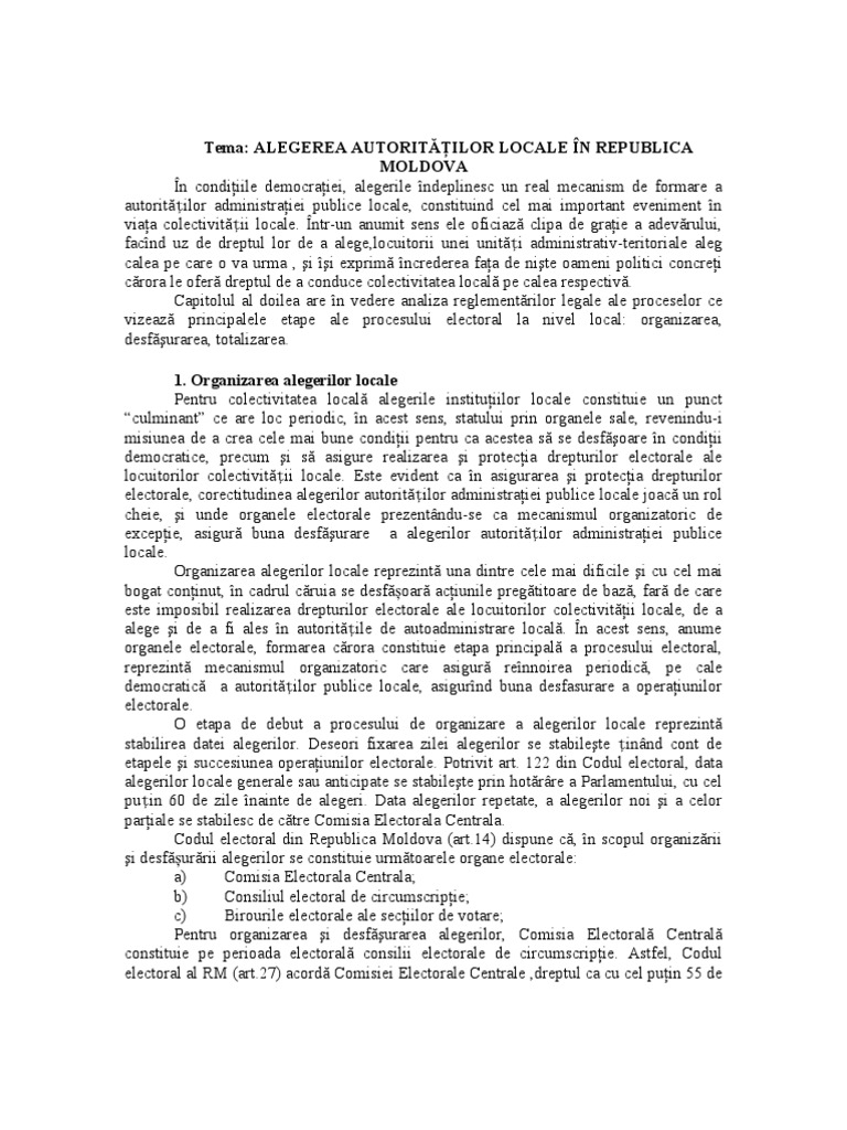 publice locale, constituind cel mai important eveniment n viaa colectivitii locale. ntr-un anumit sens ele oficiaz clipa de graie a adevrului, facnd uz de dreptul lor de a alege,locuitorii unei uniti administrativ-teritoriale aleg calea pe care o va urma , i i exprim ncrederea faa de nite oameni politici concrei crora le ofer dreptul de a conduce colectivitatea local pe calea respectiv. Capitolul al doilea are n vedere analiza reglementrilor legale ale proceselor ce vizeaz principalele etape ale procesului electoral la nivel local: organizarea, desfurarea, totalizarea. 1. Organizarea alegerilor locale Pentru colectivitatea local alegerile instituiilor locale constituie un punct culminant ce are loc periodic, n acest sens, statului prin organele sale, revenindu-i misiunea de a crea cele mai bune condiii pentru ca acestea s se desfoare n condiii democratice, precum i s asigure realizarea i protecia drepturilor electorale ale locuitorilor colectivitii locale. Este evident ca n asigurarea i protecia drepturilor electorale, corectitudinea alegerilor autoritilor administraiei publice locale joac un rol cheie, i unde organele electorale prezentndu-se ca mecanismul organizatoric de excepie, asigur buna desfurare a alegerilor autoritilor administraiei publice locale. Organizarea alegerilor locale reprezint una dintre cele mai dificile i cu cel mai bogat coninut, n cadrul cruia se desfoar aciunile pregtitoare de baz, far de care este imposibil realizarea drepturilor electorale ale locuitorilor colectivitii locale, de a alege i de a fi ales n autoritile de autoadministrare local. n acest sens, anume organele electorale, formarea crora constituie etapa principal a procesului electoral, reprezint mecanismul organizatoric care asigur rennoirea periodic, pe cale democratic a autoritilor publice locale, asigurnd buna desfasurare a operaiunilor electorale. O etapa de debut a procesului de organizare a alegerilor locale reprezint stabilirea datei alegerilor. Deseori fixarea zilei alegerilor se stabilete innd cont de etapele i succesiunea operaiunilor electorale. Potrivit art. 122 din Codul electoral, data alegerilor locale generale sau anticipate se stabilete prin hotrre a Parlamentului, cu cel puin 60 de zile nainte de alegeri. Data alegerilor repetate, a alegerilor noi i a celor pariale se stabilesc de ctre Comisia Electorala Centrala. Codul electoral din Republica Moldova (art.14) dispune c, n scopul organizrii i desfurrii alegerilor se constituie urmtoarele organe electorale: a) Comisia Electorala Centrala; b) Consiliul electoral de circumscripie; c) Birourile electorale ale seciilor de votare; Pentru organizarea i desfurarea alegerilor, Comisia Electoral Central constituie pe perioada electoral consilii electorale de circumscripie. Astfel, Codul electoral al RM (art.27) acord Comisiei Electorale Centrale ,dreptul ca cu cel puin 55 de