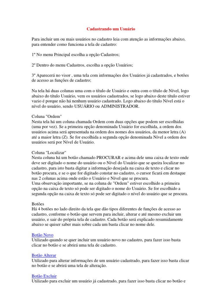 funciona a tela de cadastro: 1 No menu Principal escolha a opo Cadastros; 2 Dentro do menu Cadastros, escolha a opo Usurios; 3 Aparecer no visor , uma tela com informaes dos Usurios j cadastrados, e botes de acesso as funes de cadastro; Na tela h duas colunas uma com o ttulo de Usurio e outra com o ttulo de Nvel, logo abaixo do ttulo Usurio, vem os usurios cadastrados, se logo abaixo deste ttulo estiver vazio porque no h nenhum usurio cadastrado. Logo abaixo do ttulo Nvel est o nvel do usurio, sendo USURIO ou ADMINISTRADOR. Coluna "Ordem" Nesta tela h um coluna chamada Ordem com duas opes que podem ser escolhidas (uma por vez). Se a primeira opo denominada Usurio for escolhida, a ordem dos usurios acima ser apresentada na ordem dos nomes dos usurios, da menor letra (A) at a maior letra (Z). Se for escolhida a segunda opo denominada Nvel a ordem dos usurios ser por Nvel de Usurio. Coluna "Localizar" Nesta coluna h um boto chamado PROCURAR e acima dele uma caixa de texto onde deve ser digitado o nome do usurio ou o Nvel do Usurio que se queira localizar no cadastro, para isto basta digitar a informao desejada na caixa de texto e clicar no boto procura, e se o que for digitado constar no cadastro, o cursor ficar em destaque nas 2 colunas acima onde esto o Usurio e Nvel que se procura. Uma observao importante, se na coluna de "Ordem" estiver escolhido a primeira opo na caixa de texto s pode ser digitado o nome do Usurio. Se for escolhido a segunda opo na caixa de texto s pode ser digitado o nvel do usurio que se procura. Botes H 4 botes no lado direito da tela que do tipos diferentes de funes de acesso ao cadastro, conforme o boto que servem para incluir, alterar e at mesmo excluir um usurio, e sair do prpria tela de cadastro. Cada boto ser explicado resumidamente abaixo se quiser saber mais sobre cada um basta clicar no nome dele. Boto Novo Utilizado quando se quer incluir um usurio novo no cadastro, para fazer isso basta clicar no boto e se abrir uma tela de cadastro. Boto Alterar Utilizado para alterar informaes de um usurio cadastrado, para fazer isso basta clicar no boto e se abrir uma tela de alterao. Boto Excluir Utilizado para excluir um usurio j cadastrado, para fazer isso basta clicar no boto e