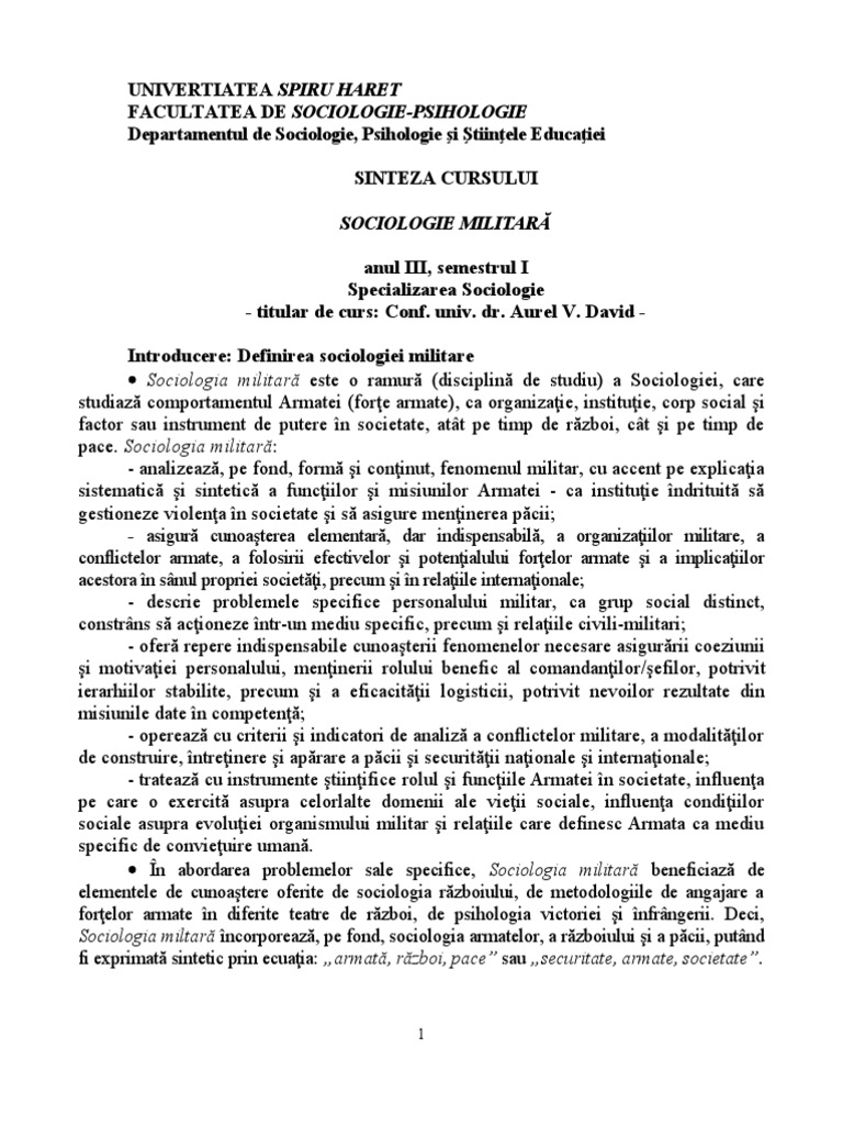 III, semestrul I Specializarea Sociologie - titular de curs: Conf. univ. dr. Aurel V. David Introducere: Definirea sociologiei militare Sociologia militar este o ramur (disciplin de studiu) a Sociologiei, care studiaz comportamentul Armatei (fore armate), ca organizaie, instituie, corp social i factor sau instrument de putere n societate, att pe timp de rzboi, ct i pe timp de pace. Sociologia militar: - analizeaz, pe fond, form i coninut, fenomenul militar, cu accent pe explicaia sistematic i sintetic a funciilor i misiunilor Armatei - ca instituie ndrituit s gestioneze violena n societate i s asigure meninerea pcii; - asigur cunoaterea elementar, dar indispensabil, a organizaiilor militare, a conflictelor armate, a folosirii efectivelor i potenialului forelor armate i a implicaiilor acestora n snul propriei societi, precum i n relaiile internaionale; - descrie problemele specifice personalului militar, ca grup social distinct, constrns s acioneze ntr-un mediu specific, precum i relaiile civili-militari; - ofer repere indispensabile cunoaterii fenomenelor necesare asigurrii coeziunii i motivaiei personalului, meninerii rolului benefic al comandanilor/efilor, potrivit ierarhiilor stabilite, precum i a eficacitii logisticii, potrivit nevoilor rezultate din misiunile date n competen; - opereaz cu criterii i indicatori de analiz a conflictelor militare, a modalitilor de construire, ntreinere i aprare a pcii i securitii naionale i internaionale; - trateaz cu instrumente tiinifice rolul i funciile Armatei n societate, influena pe care o exercit asupra celorlalte domenii ale vieii sociale, influena condiiilor sociale asupra evoluiei organismului militar i relaiile care definesc Armata ca mediu specific de convieuire uman. n abordarea problemelor sale specifice, Sociologia militar beneficiaz de elementele de cunoatere oferite de sociologia rzboiului, de metodologiile de angajare a forelor armate n diferite teatre de rzboi, de psihologia victoriei i nfrngerii. Deci, Sociologia miltar ncorporeaz, pe fond, sociologia armatelor, a rzboiului i a pcii, putnd fi exprimat sintetic prin ecuaia: armat, rzboi, pace sau securitate, armate, societate.