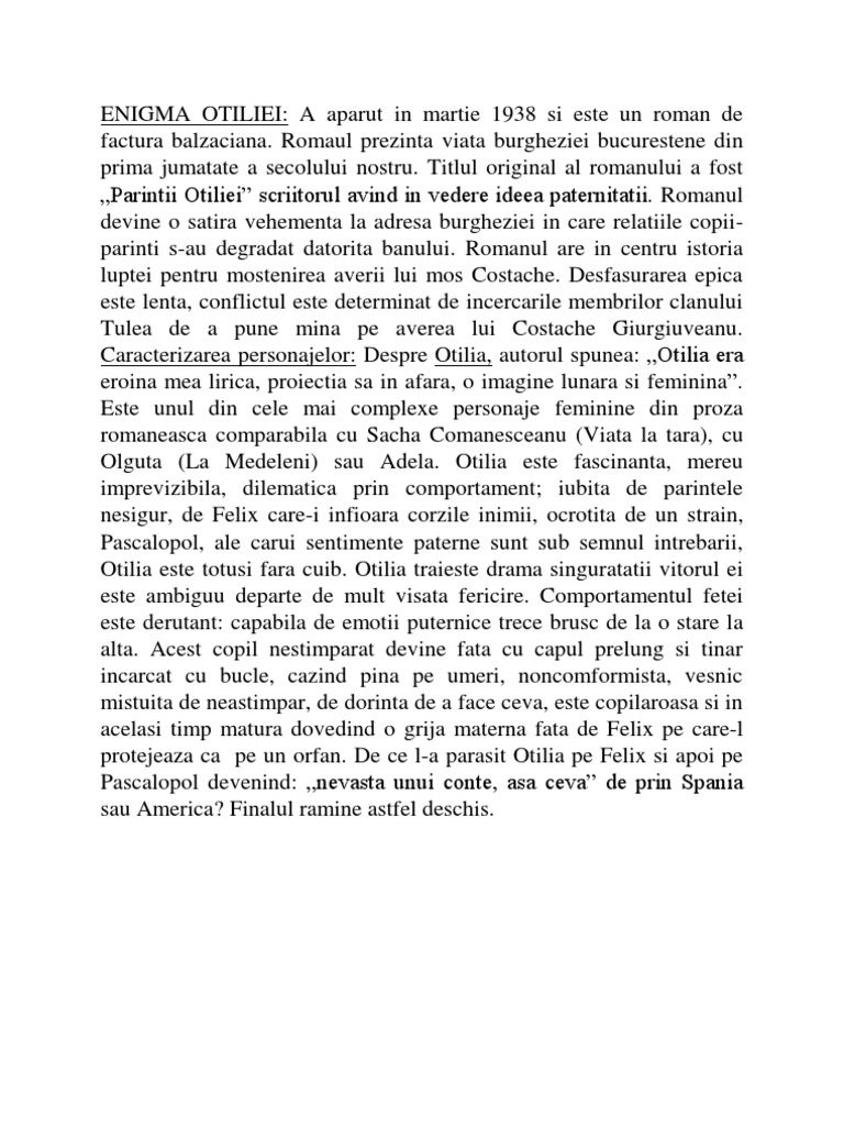 Romaul prezinta viata burgheziei bucurestene din prima jumatate a secolului nostru. Titlul original al romanului a fost Parintii Otiliei scriitorul avind in vedere ideea paternitatii. Romanul devine o satira vehementa la adresa burgheziei in care relatiile copiiparinti s-au degradat datorita banului. Romanul are in centru istoria luptei pentru mostenirea averii lui mos Costache. Desfasurarea epica este lenta, conflictul este determinat de incercarile membrilor clanului Tulea de a pune mina pe averea lui Costache Giurgiuveanu. Caracterizarea personajelor: Despre Otilia, autorul spunea: Otilia era eroina mea lirica, proiectia sa in afara, o imagine lunara si feminina. Este unul din cele mai complexe personaje feminine din proza romaneasca comparabila cu Sacha Comanesceanu (Viata la tara), cu Olguta (La Medeleni) sau Adela. Otilia este fascinanta, mereu imprevizibila, dilematica prin comportament; iubita de parintele nesigur, de Felix care-i infioara corzile inimii, ocrotita de un strain, Pascalopol, ale carui sentimente paterne sunt sub semnul intrebarii, Otilia este totusi fara cuib. Otilia traieste drama singuratatii vitorul ei este ambiguu departe de mult visata fericire. Comportamentul fetei este derutant: capabila de emotii puternice trece brusc de la o stare la alta. Acest copil nestimparat devine fata cu capul prelung si tinar incarcat cu bucle, cazind pina pe umeri, noncomformista, vesnic mistuita de neastimpar, de dorinta de a face ceva, este copilaroasa si in acelasi timp matura dovedind o grija materna fata de Felix pe care-l protejeaza ca pe un orfan. De ce l-a parasit Otilia pe Felix si apoi pe Pascalopol devenind: nevasta unui conte, asa ceva de prin Spania sau America? Finalul ramine astfel deschis.