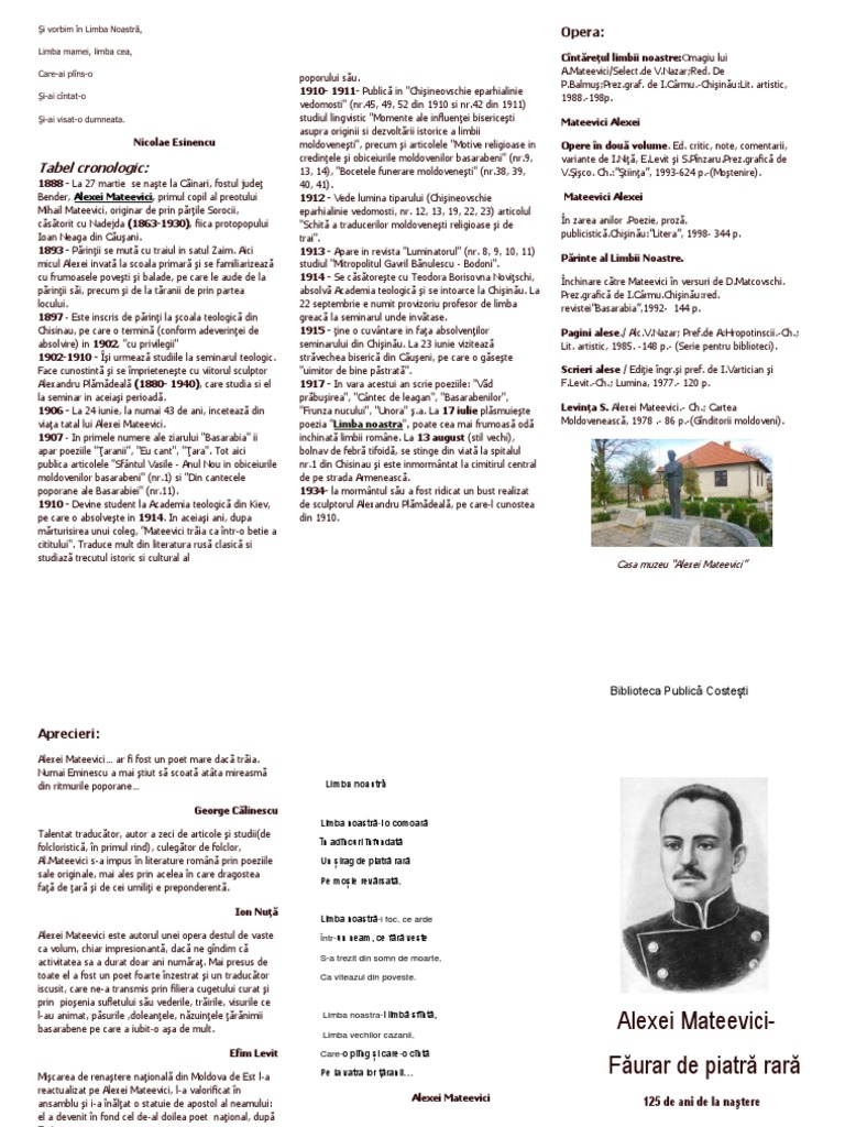 poporului su. 1910- 1911- Public in "Chiineovschie eparhialinie vedomosti" (nr.45, 49, 52 din 1910 si nr.42 din 1911) studiul lingvistic "Momente ale influenei bisericeti asupra originii si dezvoltrii istorice a limbii moldoveneti", precum i articolele "Motive religioase in credinele i obiceiurile moldovenilor basarabeni" (nr.9, 13, 14), "Bocetele funerare moldoveneti" (nr.38, 39, 40, 41). 1912 - Vede lumina tiparului (Chiineovschie eparhialinie vedomosti, nr. 12, 13, 19, 22, 23) articolul "Schit a traducerilor moldoveneti religioase i de trai". 1913 - Apare in revista "Luminatorul" (nr. 8, 9, 10, 11) studiul "Mitropolitul Gavril Bnulescu - Bodoni". 1914 - Se cstorete cu Teodora Borisovna Novischi, absolv Academia teologic i se intoarce la Chiinu. La 22 septembrie e numit provizoriu profesor de limba greac la seminarul unde invtase. 1915 - ine o cuvntare in faa absolvenilor seminarului din Chiinu. La 23 iunie viziteaz strvechea biseric din Cueni, pe care o gsete "uimitor de bine pstrat". 1917 - In vara acestui an scrie poeziile: "Vd prbuirea", "Cntec de leagan", "Basarabenilor", "Frunza nucului", "Unora" .a. La 17 iulie plsmuiete poezia "Limba noastra", poate cea mai frumoas od inchinat limbii romne. La 13 august (stil vechi), bolnav de febr tifoid, se stinge din viat la spitalul nr.1 din Chisinau i este inmormntat la cimitirul central de pe strada Armeneasc. 1934- la mormntul su a fost ridicat un bust realizat de sculptorul Alexandru Plmdeal, pe care-l cunostea din 1910.