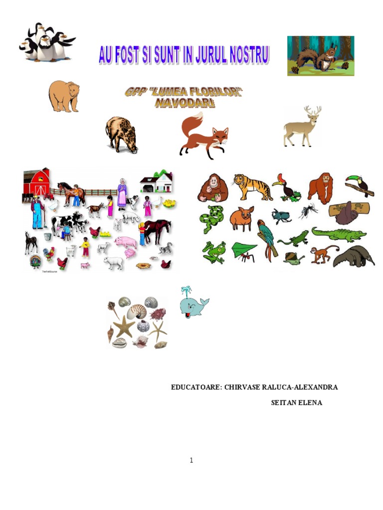 SCRISOARE DE INTENIE CTRE PRINI Stimai prini ncepnd cu data de 28 ianuarie 2013, pe parcursul a trei sptmni , n cadrul activitilor pe care le vom desfura, vom organiza un proiect cu tema Au fost si sunt in jurul nostru. Este un proiect despre animalele domestice si salbatice din tara noastra, precum si din alte locuri de pe pamant.n acest scop v rugm s discutai cu copiii dumneavoastr i s vizionai emisiuni la diferite posturi referitoare la tema anunat. Orice materiale legate de tem: imagini din reviste, poze, cri i alte informaii despre animaleledomestice si slbatice din ara noastr, le putei aduce la grdini. V mulumim pentru ajutor i v invitm lng noi! Copiii grupei i educatoarea CENTRUL TEMATIC -planse cu animale (domestice, salbatice din padure, salbatice din alte tari, acvatice), animale din plastic
