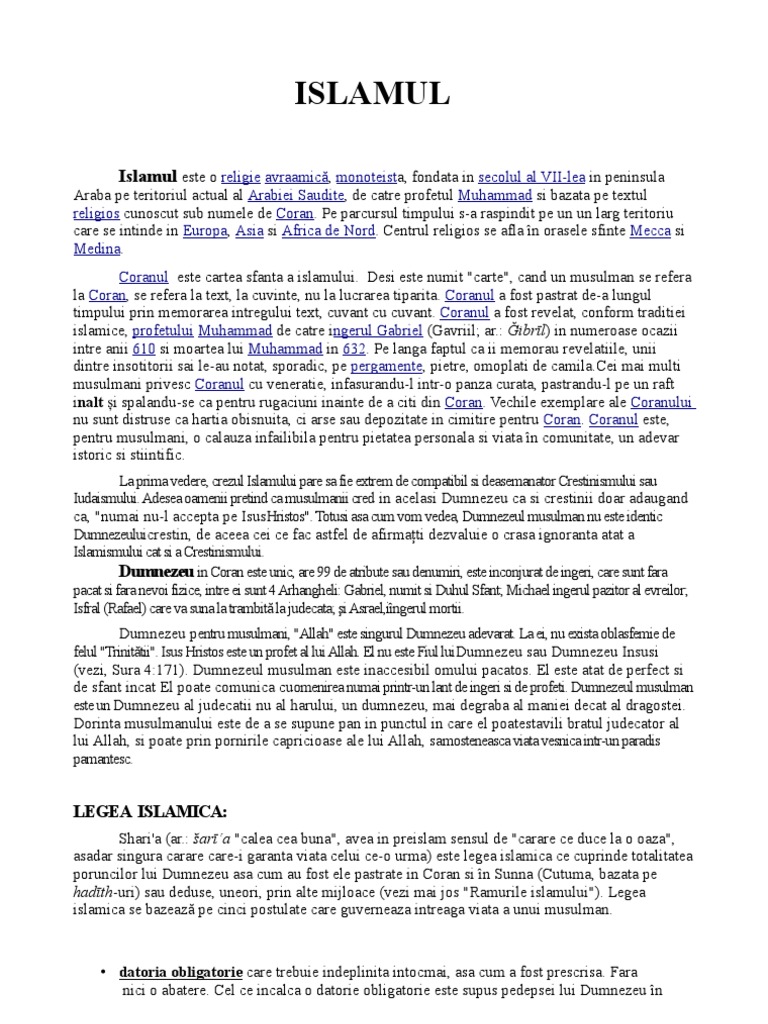 Coranul este cartea sfanta a islamului. Desi este numit "carte", cand un musulman se refera la Coran, se refera la text, la cuvinte, nu la lucrarea tiparita. Coranul a fost pastrat de-a lungul timpului prin memorarea intregului text, cuvant cu cuvant. Coranul a fost revelat, conform traditiei islamice, profetului Muhammad de catre ingerul Gabriel (Gavriil; ar.: ibrl) in numeroase ocazii intre anii 610 si moartea lui Muhammad in 632. Pe langa faptul ca ii memorau revelatiile, unii dintre insotitorii sai le-au notat, sporadic, pe pergamente, pietre, omoplati de [Link] mai multi musulmani privesc Coranul cu veneratie, infasurandu-l intr-o panza curata, pastrandu-l pe un raft inalt i spalandu-se ca pentru rugaciuni inainte de a citi din Coran. Vechile exemplare ale Coranului nu sunt distruse ca hartia obisnuita, ci arse sau depozitate in cimitire pentru Coran. Coranul este, pentru musulmani, o calauza infailibila pentru pietatea personala si viata n comunitate, un adevar istoric si stiintific. La prima vedere, crezul Islamului pare sa fie extrem de compatibil si deasemanator Crestinismului sau Iudaismului. Adesea oamenii pretind ca musulmanii cred in acelasi Dumnezeu ca si crestinii doar adaugand ca, "numai nu-l accepta pe IsusHristos". Totusi asa cum vom vedea, Dumnezeul musulman nu este identic Dumnezeuluicrestin, de aceea cei ce fac astfel de afirmati dezvaluie o crasa ignoranta atat a Islamismului cat si a Crestinismului. Dumnezeu in Coran este unic, are 99 de atribute sau denumiri, este inconjurat de ingeri, care sunt fara pacat si fara nevoi fizice, intre ei sunt 4 Arhangheli: Gabriel, numit si Duhul Sfant; Michael ingerul pazitor al evreilor; Isfral (Rafael) care va suna la trambit la judecata; i Asrael,ingerul mortii. Dumnezeu pentru musulmani, "Allah" este singurul Dumnezeu adevarat. La ei, nu exista oblasfemie de felul "Trinittii". Isus Hristos este un profet al lui Allah. El nu este Fiul luiDumnezeu sau Dumnezeu Insusi (vezi, Sura 4:171). Dumnezeul musulman este inaccesibil omului pacatos. El este atat de perfect si de sfant incat El poate comunica cuomenirea numai printr-un lant de ingeri si de profeti. Dumnezeul musulman este un Dumnezeu al judecatii nu al harului, un dumnezeu, mai degraba al maniei decat al dragostei. Dorinta musulmanului este de a se supune pan in punctul in care el poatestavili bratul judecator al lui Allah, si poate prin pornirile capricioase ale lui Allah, samosteneasca viata vesnica intr-un paradis pamantesc.