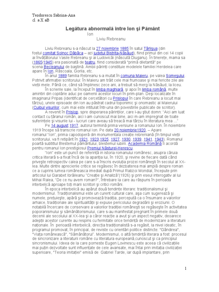 Liviu Rebreanu s-a nscut la 27 noiembrie 1885 n satul Trliua (din fostul comitat Solnoc Dbca azi judeul Bistria-Nsud), fiind primul din cei 14 copii ai nvtorului Vasile Rebreanu i ai Ludovici (nscut Diuganu). n tineree, mama sa (1865/1945) era pasionat de teatru, fiind considerat "prim diletant" pe scena Becleanului de batin. Ambii prini constituie modelele familiei Herdelea care apare n Ion, Rscoala, Gorila, etc. n anul 1889 familia Rebreanu s-a mutat n comuna Maieru, pe valea Someului. Potrivit afirmaiei scriitorului: n Maieru am trit cele mai frumoase i mai fericite zile ale vieii mele. Pn ce, cnd s mplinesc zece ani, a trebuit s merg la Nsud, la liceu. n scrierile sale, la nceput n limba maghiar, i apoi n limba romn, multe amintiri din copilrie aduc pe oamenii acestor locuri n prim-plan. Dei localizate n imaginarul Pripas (identificat de cercettori cu Prislopul n care Rebreanu a locuit mai trziu), unele episoade din Ion au pstrat cadrul toponimic i onomastic al Maierului (Cuibul visurilor, cum mai este intitulat ntr-una din povestirile publicate de scriitor). A revenit n Prislop, spre disperarea prinilor, care l-au tiut domn: Aici am luat contact cu ranul romn, aici l-am cunoscut mai bine, aici m-am impregnat de toate suferinele i visurile lui - lucruri care aveau s treac mai trziu n literatura mea ... Pe 14 august 1917, autorul termin prima versiune a romanului Ion. n noiembrie 1919 ncepe s transcrie romanul Ion. Pe data 20 noiembrie1920, Apare romanul Ion, prima capodoper din monumentala creaie rebrenian (n timpul vieii scriitorului, va fi retiprit n 1921, 1923,1925, 1927, 1930, 1939, 1941, 1943). Romanul poart subtitlul Blestemul pmntului, blestemul iubirii. Academia Romn i acord pentru romanul Ion prestigiosul Premiul Nsturel-Herescu. Ion este un punct de referin in istoria romanului romnesc, asupra cruia critica literar s-a fixat nc de la apariia lui, n 1920, i revine de fiecare dat cnd privete retrospectiv calea pe care s-a nscris evoluia prozei romneti n secolul al XXlea. Multe dintre aprecierile critice se regsesc n dezbaterea mai ampl despre roman ce a cuprins lumea romneasca imediat dup Primul Rabzoi Mondial, ncepute prin articolul lui Garabet Ibrileanu Creaie i Analiz(1926) i prin eseul interogativ al lui Mihai Ralea, De ce nu avem roman?, ntrebare la care au rspuns n perioada interbelic aproape toi marii scriitori i critici romni. n epoca interbelic au aprut dou tendine literare: tradiionalismul i modernismul. Tradiionalismul este un curent cultural care, aa cum sugereaz i numele, preuiete, apr i promoveaz tradiia, perceput ca o nsumare a valorilor arhaice, tradiionale ale spiritualitii i expuse pericolului degradrii i eroziunii. O notabil ncercare de conservare a valorilor tradiiei romneti se regsete n activitatea poporanismului i smntorismului, care s-au manifestat pregnant n primele dou decenii ale secolului al XX-lea i a cror reacie a avut i un aspect negativ, deoarece adepii acestor curente au respins cu fermitate orice tendin de modernizare a literaturii naionale. n perioad interbelic, direcia tradiionalist s-a regsit, la nivel ideatic, n programul promovat, n principal, de reviste cu orientri politice distincte: "Gndirea", "Viaa romneasc", "Smntorul. Modernismul, o alt tendin literara a fost procesul de sincronizare a literaturii romne cu literatura european,cunoscut i ca principiul sincronismului. Ideea de la care porneste Eugen Lovinescu este aceea c civilizaiile mai puin dezvoltate sunt influenate de cele avansate, mai ntai prin imitaia civilizaiei superioare, "Teoria imitaiei" emis de Gabriel Tarde, iar dup implantare, prin