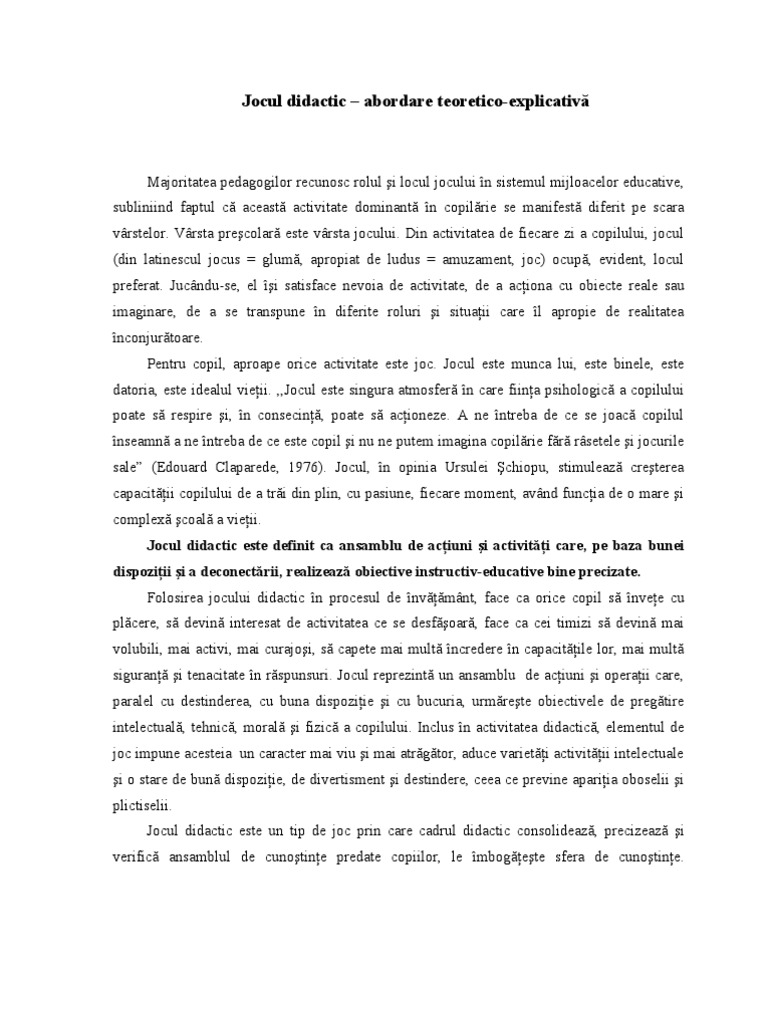 Majoritatea pedagogilor recunosc rolul i locul jocului n sistemul mijloacelor educative, subliniind faptul c aceast activitate dominant n copilrie se manifest diferit pe scara vrstelor. Vrsta precolar este vrsta jocului. Din activitatea de fiecare zi a copilului, jocul (din latinescul jocus = glum, apropiat de ludus = amuzament, joc) ocup, evident, locul preferat. Jucndu-se, el i satisface nevoia de activitate, de a aciona cu obiecte reale sau imaginare, de a se transpune n diferite roluri i situaii care l apropie de realitatea nconjurtoare. Pentru copil, aproape orice activitate este joc. Jocul este munca lui, este binele, este datoria, este idealul vieii. ,,Jocul este singura atmosfer n care fiina psihologic a copilului poate s respire i, n consecin, poate s acioneze. A ne ntreba de ce se joac copilul nseamn a ne ntreba de ce este copil i nu ne putem imagina copilrie fr rsetele i jocurile sale (Edouard Claparede, 1976). Jocul, n opinia Ursulei chiopu, stimuleaz creterea capacitii copilului de a tri din plin, cu pasiune, fiecare moment, avnd funcia de o mare i complex coal a vieii. Jocul didactic este definit ca ansamblu de aciuni i activiti care, pe baza bunei dispoziii i a deconectrii, realizeaz obiective instructiv-educative bine precizate. Folosirea jocului didactic n procesul de nvmnt, face ca orice copil s nvee cu plcere, s devin interesat de activitatea ce se desfoar, face ca cei timizi s devin mai volubili, mai activi, mai curajoi, s capete mai mult ncredere n capacitile lor, mai mult siguran i tenacitate n rspunsuri. Jocul reprezint un ansamblu de aciuni i operaii care, paralel cu destinderea, cu buna dispoziie i cu bucuria, urmrete obiectivele de pregtire intelectual, tehnic, moral i fizic a copilului. Inclus n activitatea didactic, elementul de joc impune acesteia un caracter mai viu i mai atrgtor, aduce varieti activitii intelectuale i o stare de bun dispoziie, de divertisment i destindere, ceea ce previne apariia oboselii i plictiselii. Jocul didactic este un tip de joc prin care cadrul didactic consolideaz, precizeaz i verific ansamblul de cunotine predate copiilor, le mbogete sfera de cunotine.
