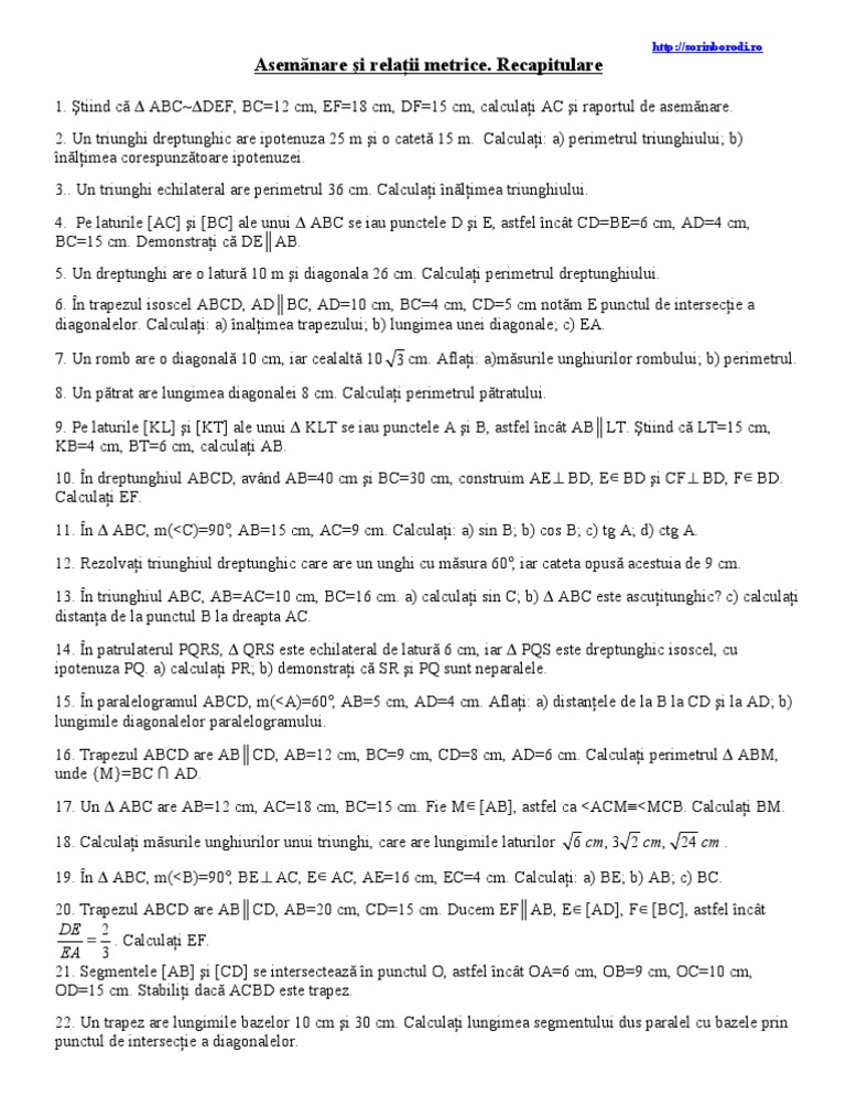 1. tiind c ABC~DEF, BC=12 cm, EF=18 cm, DF=15 cm, calculai AC i raportul de asemnare. 2. Un triunghi dreptunghic are ipotenuza 25 m i o catet 15 m. Calculai: a) perimetrul triunghiului; b) nlimea corespunztoare ipotenuzei. 3.. Un triunghi echilateral are perimetrul 36 cm. Calculai nlimea triunghiului. 4. Pe laturile [AC] i [BC] ale unui ABC se iau punctele D i E, astfel nct CD=BE=6 cm, AD=4 cm, BC=15 cm. Demonstrai c DEAB. 5. Un dreptunghi are o latur 10 m i diagonala 26 cm. Calculai perimetrul dreptunghiului. 6. n trapezul isoscel ABCD, ADBC, AD=10 cm, BC=4 cm, CD=5 cm notm E punctul de intersecie a diagonalelor. Calculai: a) nalimea trapezului; b) lungimea unei diagonale; c) EA. 7. Un romb are o diagonal 10 cm, iar cealalt 10 3 cm. Aflai: a)msurile unghiurilor rombului; b) perimetrul. 8. Un ptrat are lungimea diagonalei 8 cm. Calculai perimetrul ptratului. 9. Pe laturile [KL] i [KT] ale unui KLT se iau punctele A i B, astfel nct ABLT. tiind c LT=15 cm, KB=4 cm, BT=6 cm, calculai AB. 10. n dreptunghiul ABCD, avnd AB=40 cm i BC=30 cm, construim AE BD, E BD i CF BD, F BD. Calculai EF. 11. n ABC, m(<C)=90, AB=15 cm, AC=9 cm. Calculai: a) sin B; b) cos B; c) tg A; d) ctg A. 12. Rezolvai triunghiul dreptunghic care are un unghi cu msura 60, iar cateta opus acestuia de 9 cm. 13. n triunghiul ABC, AB=AC=10 cm, BC=16 cm. a) calculai sin C; b) ABC este ascuitunghic? c) calculai distana de la punctul B la dreapta AC. 14. n patrulaterul PQRS, QRS este echilateral de latur 6 cm, iar PQS este dreptunghic isoscel, cu ipotenuza PQ. a) calculai PR; b) demonstrai c SR i PQ sunt neparalele. 15. n paralelogramul ABCD, m(<A)=60, AB=5 cm, AD=4 cm. Aflai: a) distanele de la B la CD i la AD; b) lungimile diagonalelor paralelogramului. 16. Trapezul ABCD are ABCD, AB=12 cm, BC=9 cm, CD=8 cm, AD=6 cm. Calculai perimetrul ABM, unde {M}=BC AD. 17. Un ABC are AB=12 cm, AC=18 cm, BC=15 cm. Fie M [AB], astfel ca <ACM<MCB. Calculai BM. 18. Calculai msurile unghiurilor unui triunghi, care are lungimile laturilor 6 cm, 3 2 cm, 24 cm .