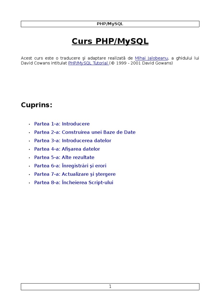 Acest curs este o traducere i adaptare realizat de Mihai Jalobeanu, a ghidului lui David Cowans intitulat PHP/MySQL Tutorial ( 1999 - 2001 David Gowans)