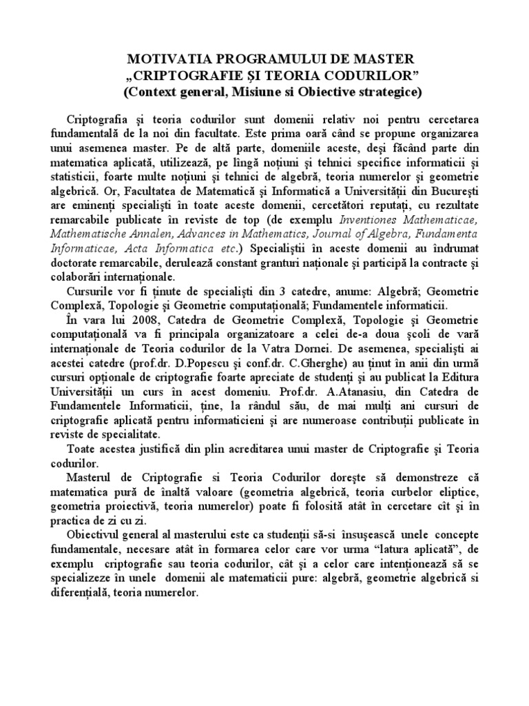 Criptografia i teoria codurilor sunt domenii relativ noi pentru cercetarea fundamental de la noi din facultate. Este prima oar cnd se propune organizarea unui asemenea master. Pe de alt parte, domeniile aceste, dei fcnd parte din matematica aplicat, utilizeaz, pe lng noiuni i tehnici specifice informaticii i statisticii, foarte multe noiuni i tehnici de algebr, teoria numerelor i geometrie algebric. Or, Facultatea de Matematic i Informatic a Universitii din Bucureti are emineni specialiti n toate aceste domenii, cercettori reputai, cu rezultate remarcabile publicate n reviste de top (de exemplu Inventiones Mathematicae, Mathematische Annalen, Advances in Mathematics, Journal of Algebra, Fundamenta Informaticae, Acta Informatica etc.) Specialitii n aceste domenii au ndrumat doctorate remarcabile, deruleaz constant granturi naionale i particip la contracte i colaborri internaionale. Cursurile vor fi inute de specialiti din 3 catedre, anume: Algebr; Geometrie Complex, Topologie i Geometrie computaional; Fundamentele informaticii. n vara lui 2008, Catedra de Geometrie Complex, Topologie i Geometrie computaional va fi principala organizatoare a celei de-a doua coli de var internaionale de Teoria codurilor de la Vatra Dornei. De asemenea, specialiti ai acestei catedre ([Link]. [Link] i [Link]. [Link]) au inut n anii din urm cursuri opionale de criptografie foarte apreciate de studeni i au publicat la Editura Universitii un curs n acest domeniu. [Link]. [Link], din Catedra de Fundamentele Informaticii, ine, la rndul su, de mai muli ani cursuri de criptografie aplicat pentru informaticieni i are numeroase contribuii publicate n reviste de specialitate. Toate acestea justific din plin acreditarea unui master de Criptografie i Teoria codurilor. Masterul de Criptografie si Teoria Codurilor dorete s demonstreze c matematica pur de nalt valoare (geometria algebric, teoria curbelor eliptice, geometria proiectiv, teoria numerelor) poate fi folosit att n cercetare ct i n practica de zi cu zi. Obiectivul general al masterului este ca studenii s-si nsueasc unele concepte fundamentale, necesare att n formarea celor care vor urma latura aplicat, de exemplu criptografie sau teoria codurilor, ct i a celor care intenioneaz s se specializeze n unele domenii ale matematicii pure: algebr, geometrie algebric si diferenial, teoria numerelor.