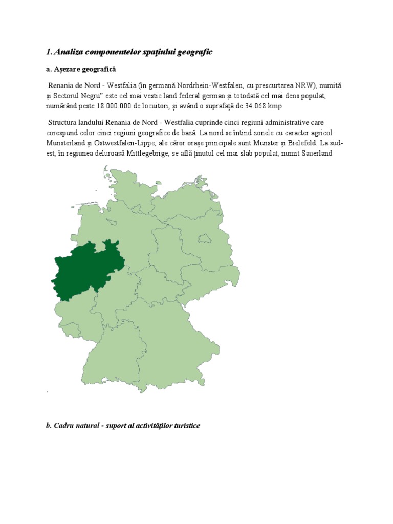 a. Aezare geografic Renania de Nord - Westfalia (n german Nordrhein-Westfalen, cu prescurtarea NRW), numit i Sectorul Negru este cel mai vestic land federal german i totodat cel mai dens populat, numrnd peste 18.000.000 de locuitori, i avnd o suprafa de 34.068 kmp Structura landului Renania de Nord - Westfalia cuprinde cinci regiuni administrative care corespund celor cinci regiuni geografice de baz. La nord se ntind zonele cu caracter agricol Munsterland i Ostwestfalen-Lippe, ale cror orae principale sunt Munster i Bielefeld. La sudest, n regiunea deluroas Mittlegebrige, se afl inutul cel mai slab populat, numit Sauerland