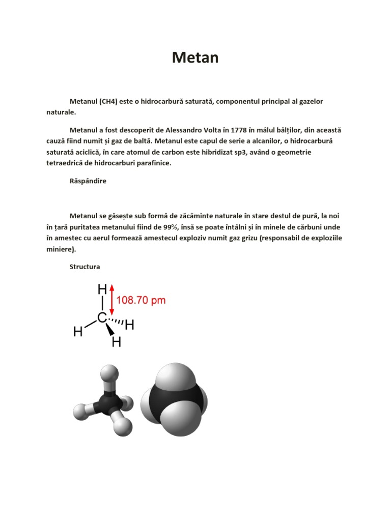 Metanul (CH4) este o hidrocarbur saturat, componentul principal al gazelor naturale. Metanul a fost descoperit de Alessandro Volta n 1778 n mlul blilor, din aceast cauz fiind numit i gaz de balt. Metanul este capul de serie a alcanilor, o hidrocarbur saturat aciclic, n care atomul de carbon este hibridizat sp3, avnd o geometrie tetraedric de hidrocarburi parafinice. Rspndire