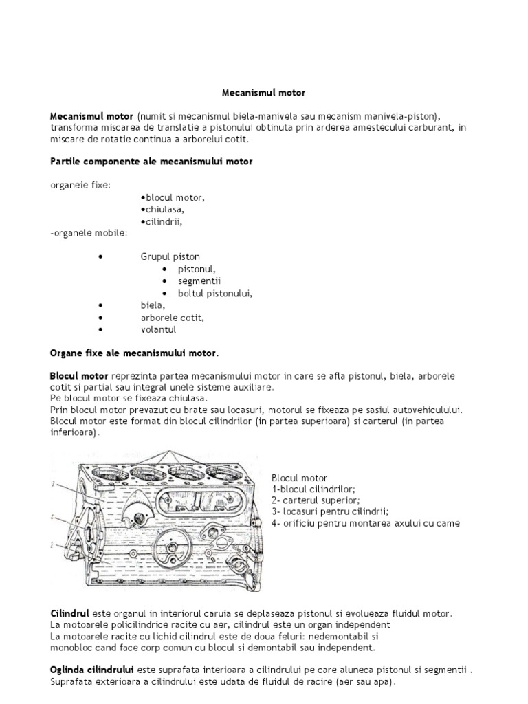 prin arderea amestecului carburant, in miscare de rotatie continua a arborelui cotit. Partile componente ale mecanismului motor organeie fixe: blocul motor, chiulasa, cilindrii, Grupul piston pistonul, segmentii boltul pistonului, biela, arborele cotit, volantul