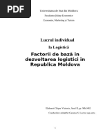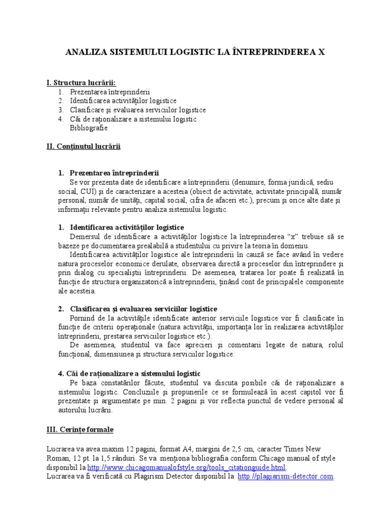 I. Structura lucrrii: 1. Prezentarea ntreprinderii 2. Identificarea activitilor logistice 3. Clasificare i evaluarea serviciilor logistice 4. Ci de raionalizare a sistemului logistic Bibliografie II. Coninutul lucrrii 1. Prezentarea ntreprinderii Se vor prezenta date de identificare a ntreprinderii (denumire, forma juridic, sediu social, CUI) i de caracterizare a acesteia (obiect de activitate, activitate principal, numr personal, numr de uniti, capital social, cifra de afaceri etc.), precum i orice alte date i informaii relevante pentru analiza sistemului logistic. 1. Identificarea activitilor logistice Demersul de identificare a activitilor logistice la ntreprinderea x trebuie s se bazeze pe documentarea prealabil a studentului cu privire la teoria n domeniu. Identificarea activitilor logistice ale ntreprinderii n cauz se face avnd n vedere natura proceselor economice derulate, observarea direct a proceselor din ntreprindere i prin dialog cu specialitii ntreprinderii. De asemenea, tratarea lor poate fi realizat n funcie de structura organizatoric a ntreprinderii, innd cont de principalele componente ale acesteia. 2. Clasificarea i evaluarea serviciilor logistice Pornind de la activitile identificate anterior serviciile logistice vor fi clasificate n funcie de criterii operaionale (natura activitii, importana lor n realizarea activitilor ntreprinderii, prestarea serviciilor logistice etc.). De asemenea, studentul va face aprecieri i comentarii legate de natura, rolul funcional, dimensiunea i structura serviciilor logistice. 4. Ci de raionalizare a sistemului logistic Pe baza constatrilor fcute, studentul va discuta posibile ci de raionalizare a sistemului logistic. Concluziile i propunerile ce se formuleaz n acest capitol vor fi prezentate i argumentate pe min. 2 pagini i vor reflecta punctul de vedere personal al autorului lucrrii. III. Cerine formale Lucrarea va avea maxim 12 pagini, format A4, margini de 2,5 cm, caracter Times New Roman, 12 pt. la 1,5 rnduri. Se va meniona bibliografia conform Chicago manual of style disponibil la [Link] Lucrarea va fi verificat cu Plagirism Detector disponibil la [Link]