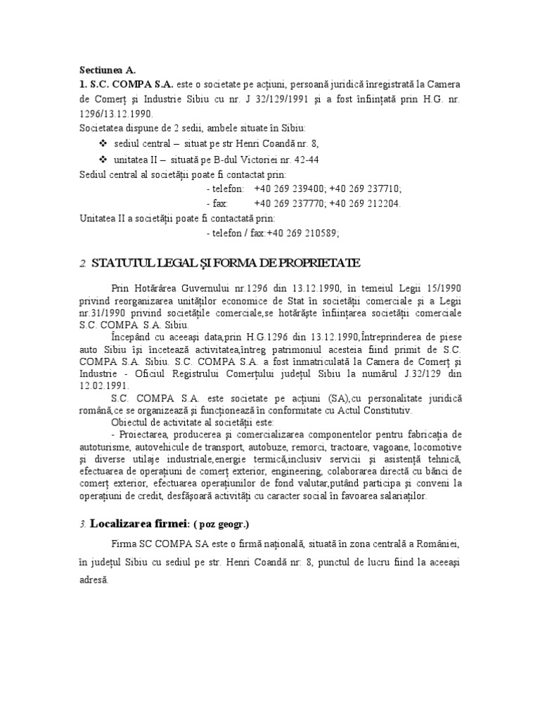 Sectiunea A. 1. S.C. COMPA S.A. este o societate pe aciuni, persoan juridic nregistrat la Camera de Comer i Industrie Sibiu cu nr.
