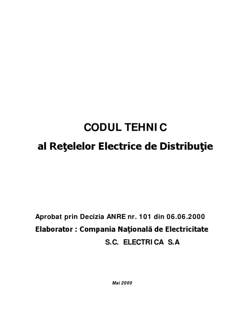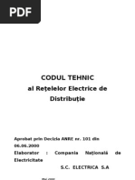 1.1 Autoritate 1.1.1 Codul tehnic al reelelor electrice de distribuie, denumit n continuare Cod, este elaborat de Compania Naional de Electricitate S.A. - S.C. ELECTRICA S.A. n conformitate cu prevederile OUG nr. 63 / 28.12.1998 publicat n Monitorul Oficial al Romniei nr. 519 / 30.12.1998, privind energia electric i termic, ale OUG nr. 29 / 22.10.1998 publicat n Monitorul Oficial al Romniei nr. 407 / 27.10.1998, privind nfiinarea, organizarea i funcionarea Autoritii Naionale de Reglementare n Domeniul Energiei A.N.R.E. (denumit n continuare Autoritatea Competent). 1.1.2 Codul se aprob prin decizie de ctre Autoritatea Competent. 1.1.3 Codul este act normativ care face parte din sistemul de reglementri ce constituie legislaia secundar pentru funcionarea pieei de energie electric. 1.1.4 Prevederile acestui Cod sunt n concordan cu Codul tehnic al reelei de transport i au prioritate fa de interesele individuale de natur economic sau financiar ale utilizatorilor reelelor electrice de distribuie. 1.2 Scop